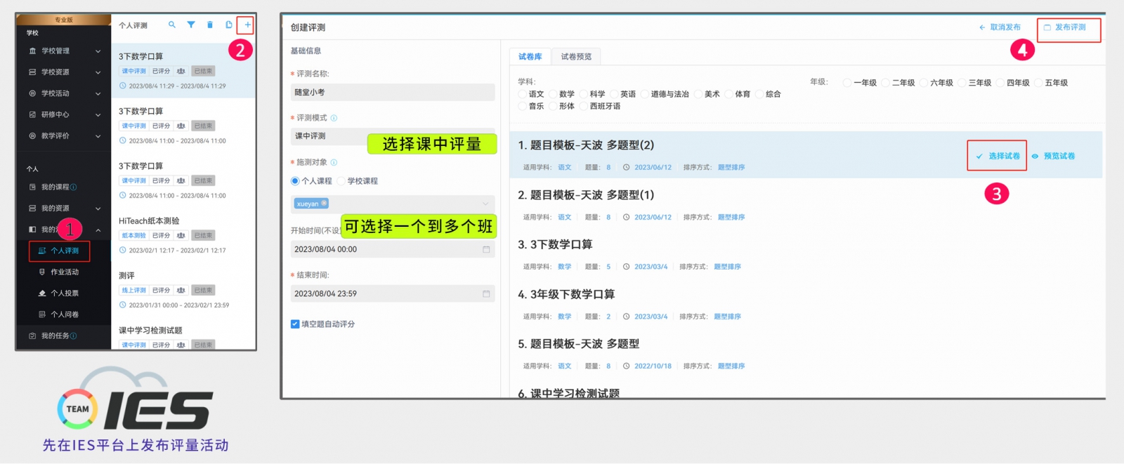 若要進(jìn)行多班、跨班級的評量與分析,則需要先在IES平臺上新增一項(xiàng)個(gè)人評量活動,評量模式需選擇智慧教室評量,以及選擇要施測的課程班級,然后選好要采用的試卷,即可正式發(fā)布評量活動。