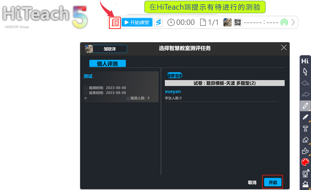 當(dāng)老師在教室里用HiTA掃碼登入HiTeach后,會看到開始課堂鈕旁邊顯示測驗(yàn)圖示,只要點(diǎn)擊這個(gè)圖示,再選擇目前要施測的班級,即可開始進(jìn)行測驗(yàn)活動。