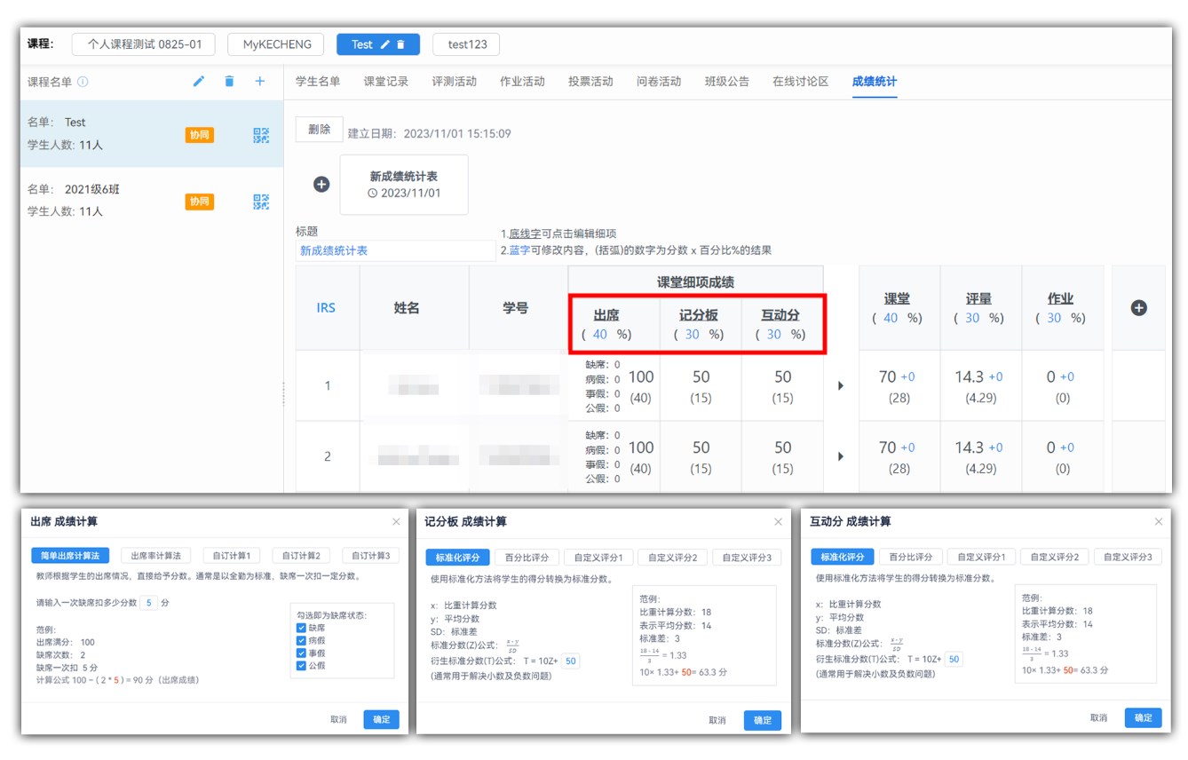 切換到完整模式后,若點(diǎn)選出席、記分板、互動(dòng)分可分別出現(xiàn)出席、記分板、互動(dòng)分的成績(jī)計(jì)算畫面,您可以變更計(jì)算方式,以符合自己的評(píng)量原則。