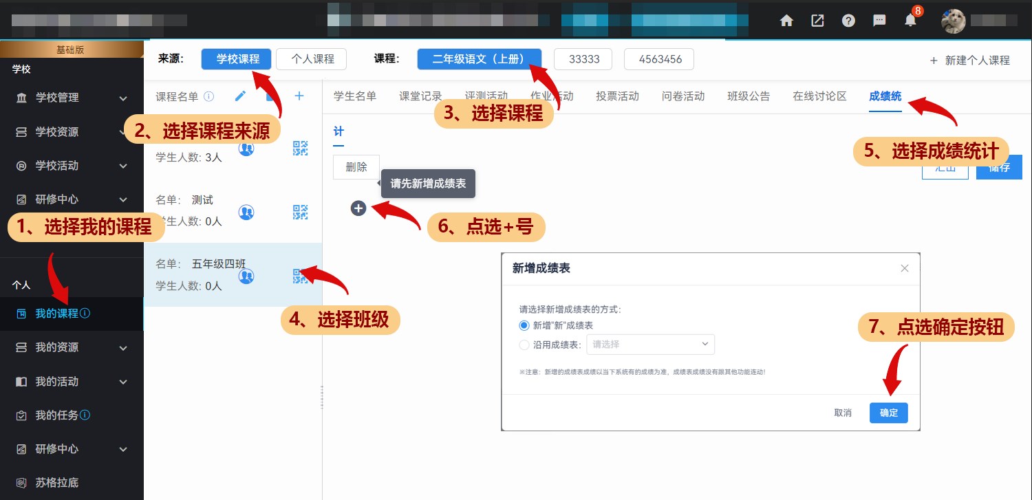 在IES中,選擇我的課程,接著選擇課程來(lái)源(個(gè)人課程或學(xué)校課程),再選擇課程名稱,然后選擇要結(jié)算成績(jī)的班級(jí),接下來(lái),選擇成績(jī)統(tǒng)計(jì),第一次使用需要點(diǎn)選+號(hào)新增成績(jī)表,再點(diǎn)選確定鈕。(教師可以建立多份成績(jī)?cè)囁惚?,以便比較分析不同算法與成績(jī))