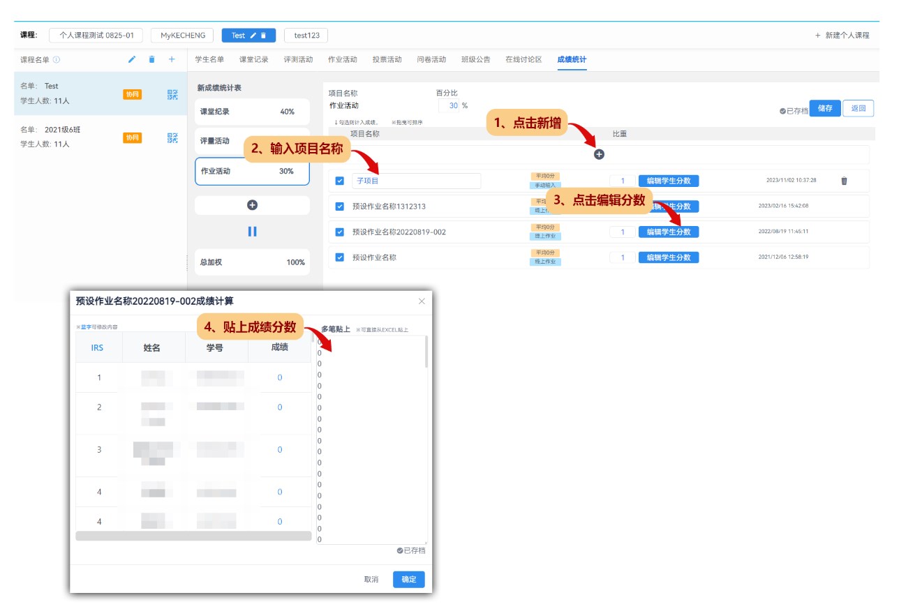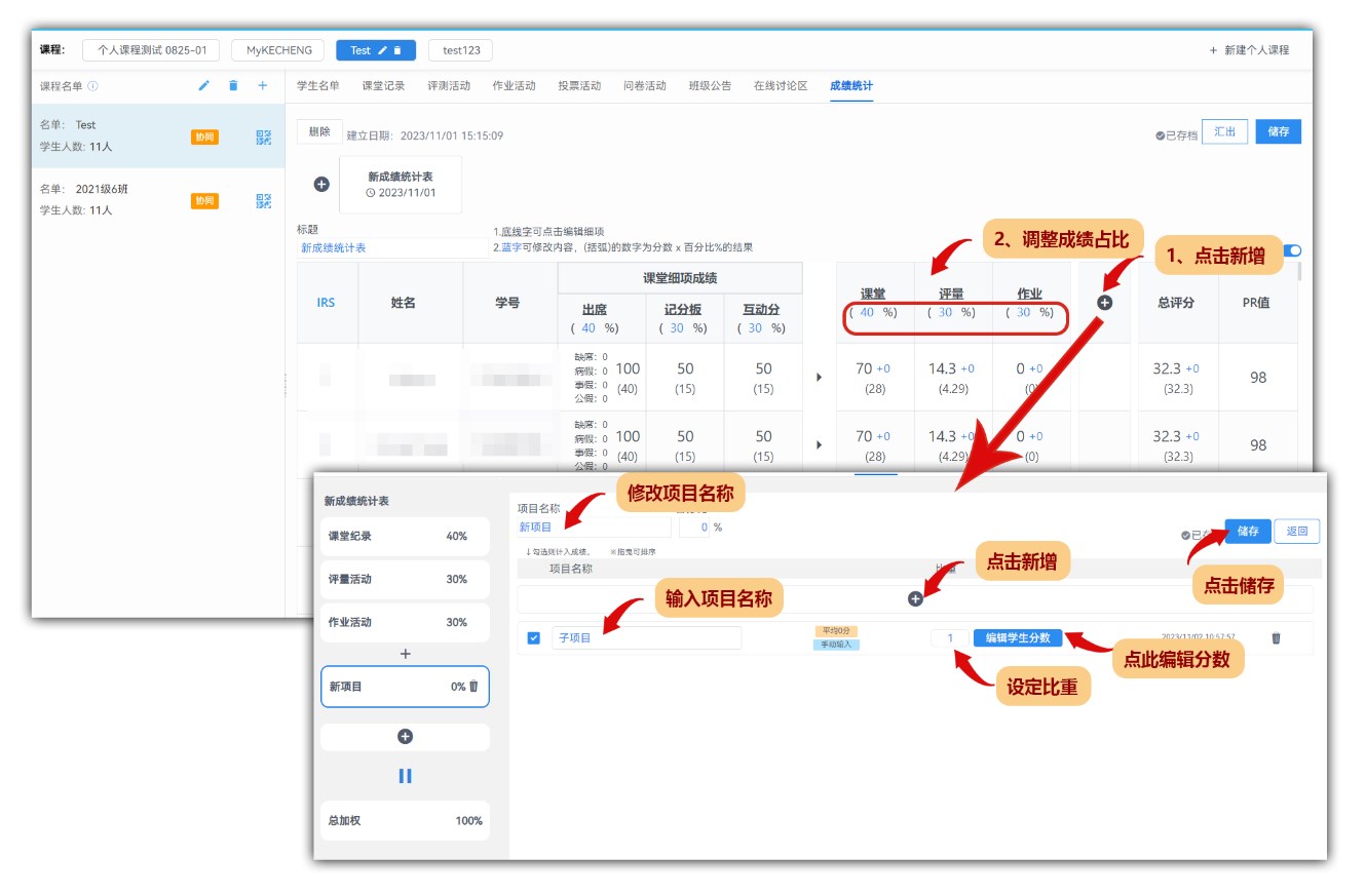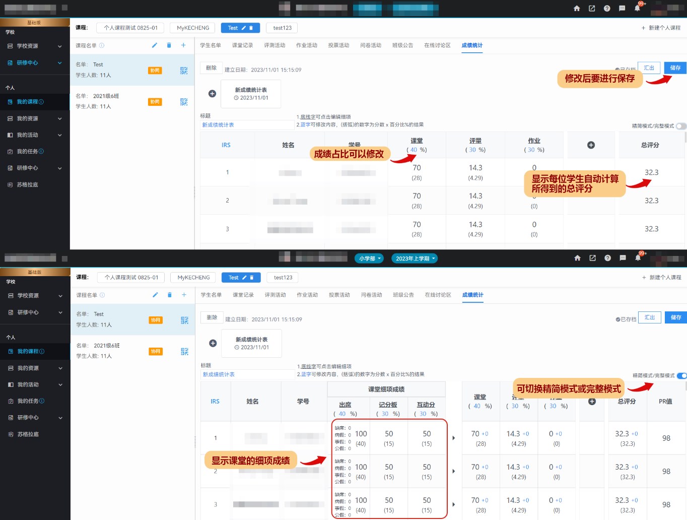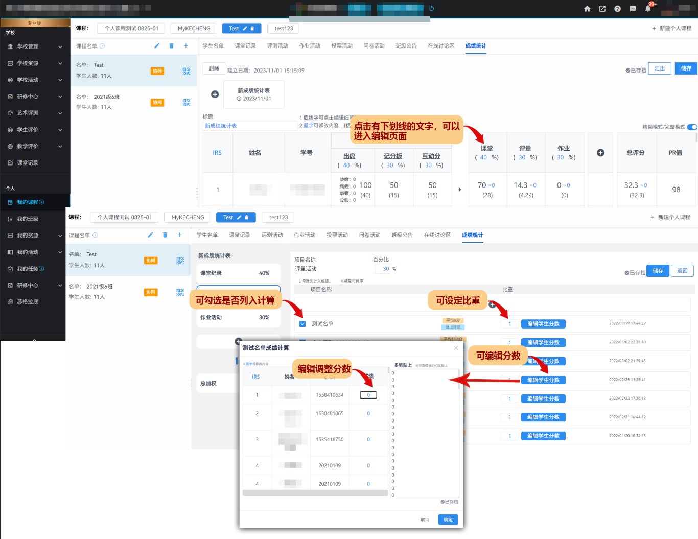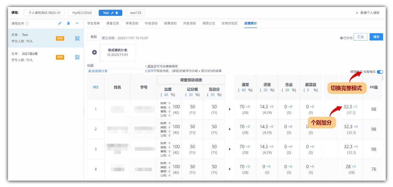 總成績(jī)自動(dòng)算好之后,假如想為某個(gè)特殊表現(xiàn)學(xué)生加分,可以切換到完整模式下,點(diǎn)選該學(xué)生總評(píng)分欄旁邊的藍(lán)色數(shù)字,輸入額外加分?jǐn)?shù)字,非常方便。