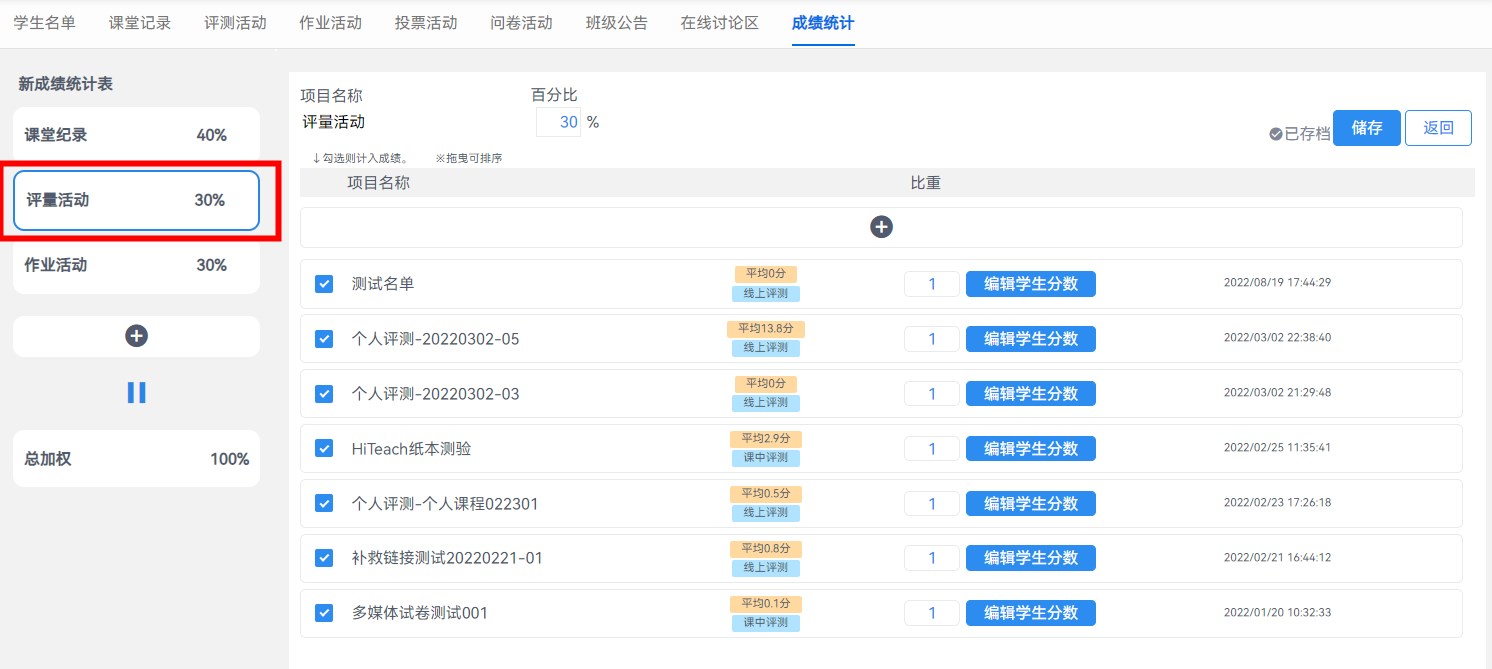 系統(tǒng)預(yù)設(shè)包含課堂、評(píng)量、作業(yè)等三大類評(píng)量類型,其分?jǐn)?shù)的整體占比可以修改。只要曾經(jīng)使用IES個(gè)人課程或?qū)W校課程進(jìn)行的活動(dòng)紀(jì)錄,平臺(tái)會(huì)依據(jù)評(píng)量類型以及歷次活動(dòng)數(shù)據(jù)的得分紀(jì)錄自動(dòng)歸類,然后根據(jù)得分與分?jǐn)?shù)占比自動(dòng)計(jì)算,列出這一班每位學(xué)生所得到的總評(píng)分。
