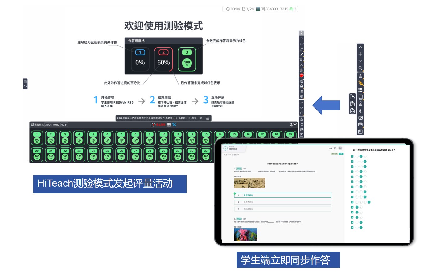 在HiTeach中使用測(cè)驗(yàn)?zāi)J竭M(jìn)行全班同步測(cè)驗(yàn)(使?HiTeach選擇IES課程名單開始課堂),或者教師利用IES來發(fā)布在線自主學(xué)習(xí)的評(píng)量活動(dòng),讓學(xué)生在課前或課后進(jìn)行測(cè)驗(yàn)活動(dòng),在測(cè)驗(yàn)結(jié)束后,學(xué)生皆可進(jìn)行學(xué)習(xí)評(píng)量后的復(fù)習(xí)活動(dòng)。