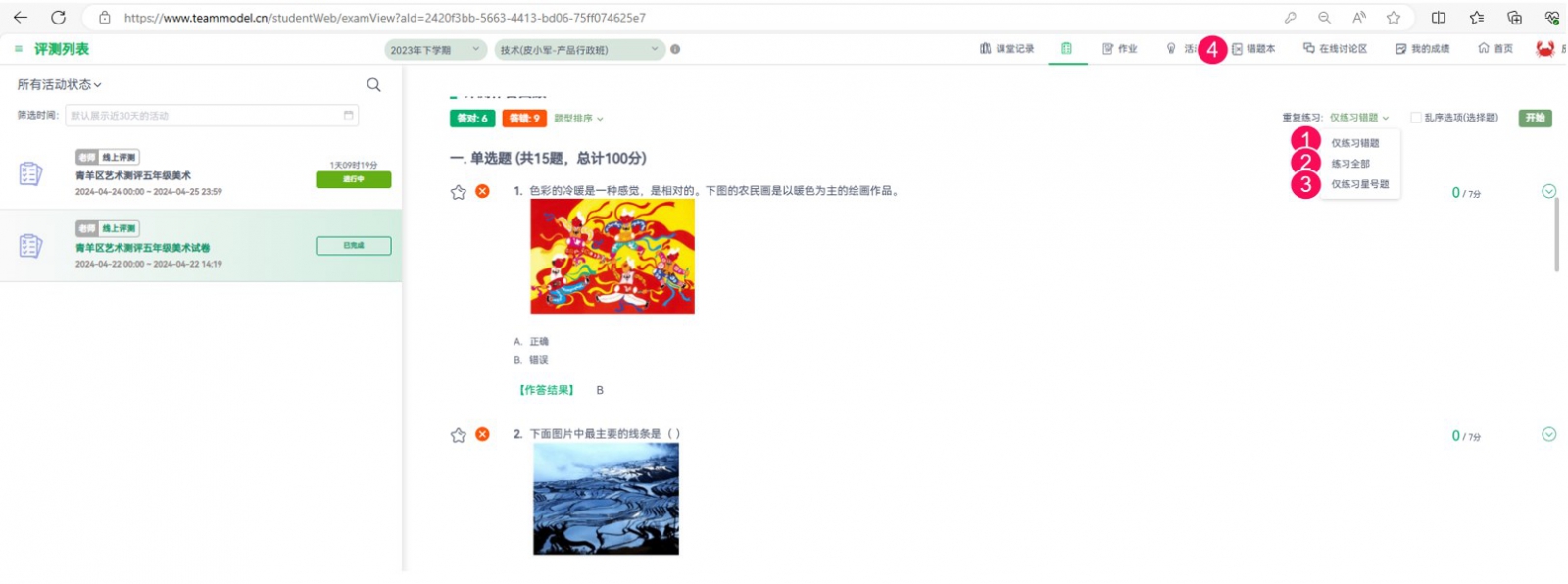 學(xué)生利用IES云平臺(tái)登入帳號(hào)后,即可查看參與的課程信息,包括學(xué)習(xí)評(píng)量的測(cè)驗(yàn)結(jié)果。最有效的復(fù)習(xí)策略,就是善用曾經(jīng)做錯(cuò)的題目來復(fù)習(xí),平臺(tái)提供學(xué)生錯(cuò)題復(fù)習(xí)的方式分為單一試卷(本試卷)與多次測(cè)驗(yàn)累積的錯(cuò)題本(本課程),包括練習(xí)錯(cuò)題(本試卷)、 練習(xí)全部試題(本試卷)、練習(xí)星號(hào)題(本試卷) 、錯(cuò)題本(本課程) 等四種復(fù)習(xí)模式。