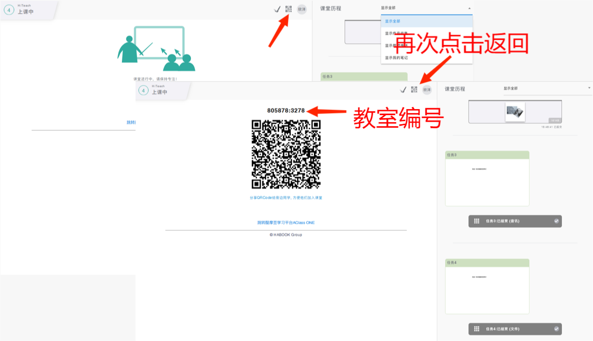 若有同學(xué)因?yàn)g覽器跳出、窗口被關(guān)閉或網(wǎng)絡(luò)環(huán)境而導(dǎo)致課堂中斷連線,又或者可能晚到等因素,需要重新連線進(jìn)入課堂,可請其他連線中的同學(xué),點(diǎn)擊二維碼鈕,就會顯示目前這堂課的二維碼與教室編號、驗(yàn)證碼信息,然后用相機(jī)掃描這個二維碼即可重新連線進(jìn)入課堂。 (或者可在瀏覽器輸入網(wǎng)址irs5.teammodel.cn,再輸入教室編號和驗(yàn)證碼,也可以連接進(jìn)入)
