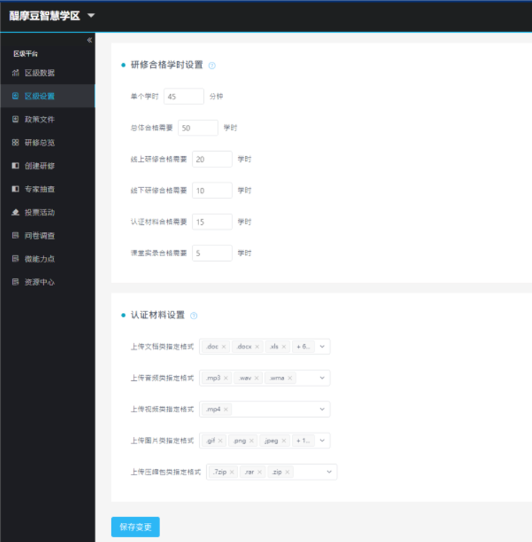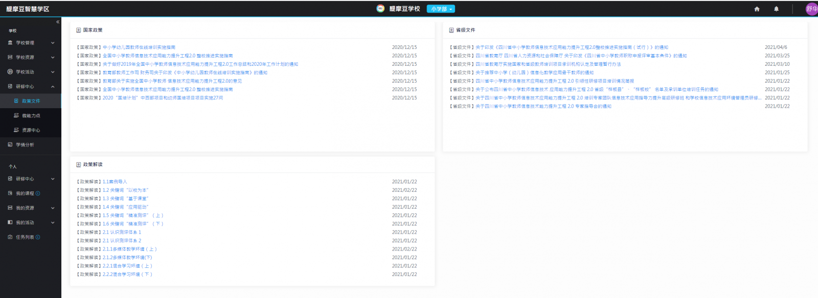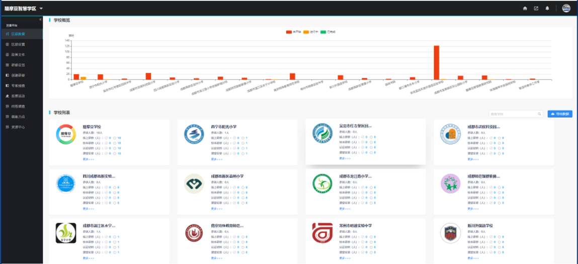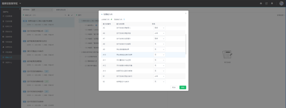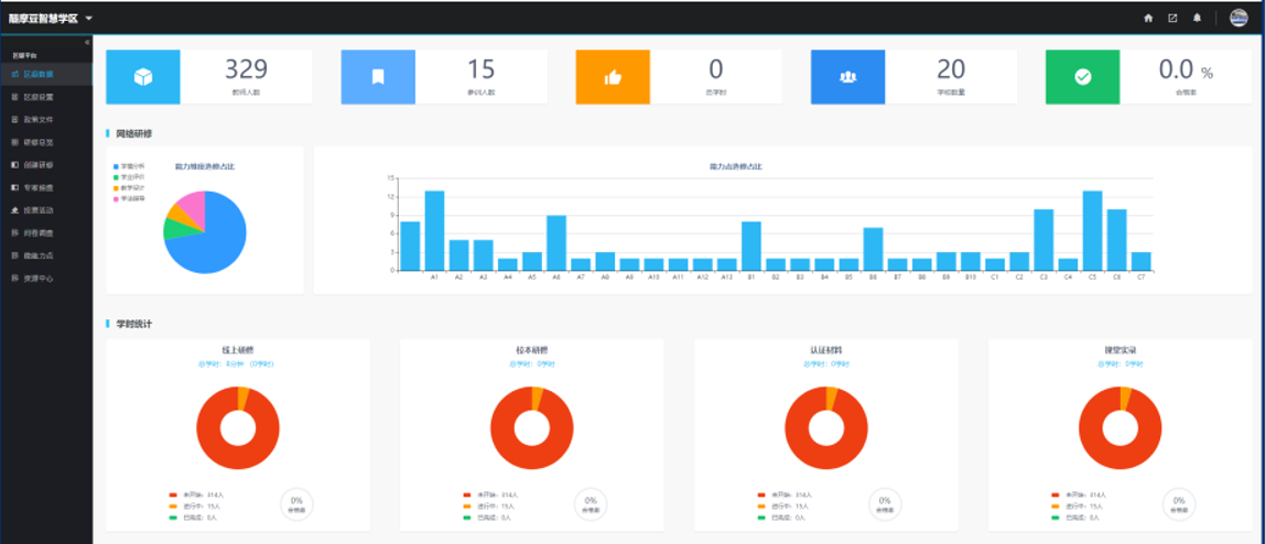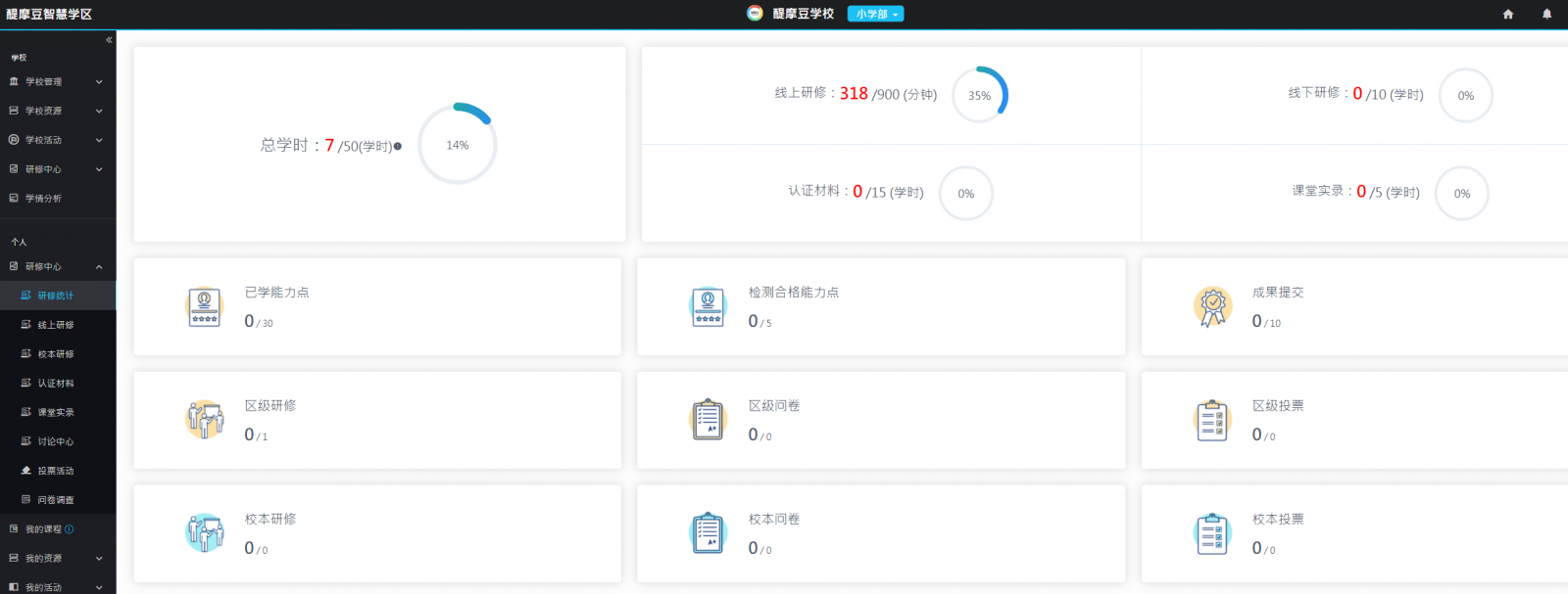 管理員可以登錄區(qū)校研修中心查看區(qū)級/校級的教師人數(shù)、參訓人數(shù)、成果考核等各項數(shù)據(jù),也能進行學區(qū)、學校的資源統(tǒng)籌管理,查看學區(qū)/學校所有參訓老師研修的具體情況,同時還能設置學時管理、成果考核,并根據(jù)區(qū)域/學校的發(fā)展目標及教學特色選擇重點研修的微能力點,進行必修微能力點/選修微能力點的統(tǒng)一設置。