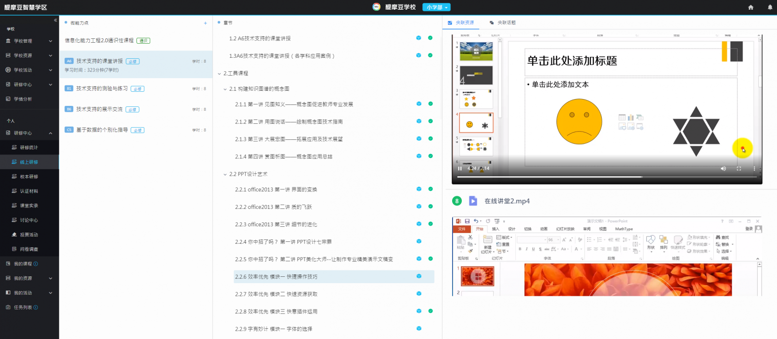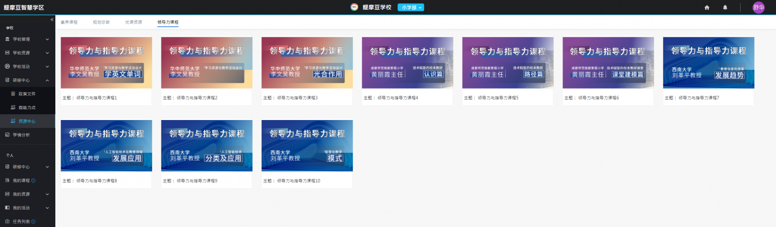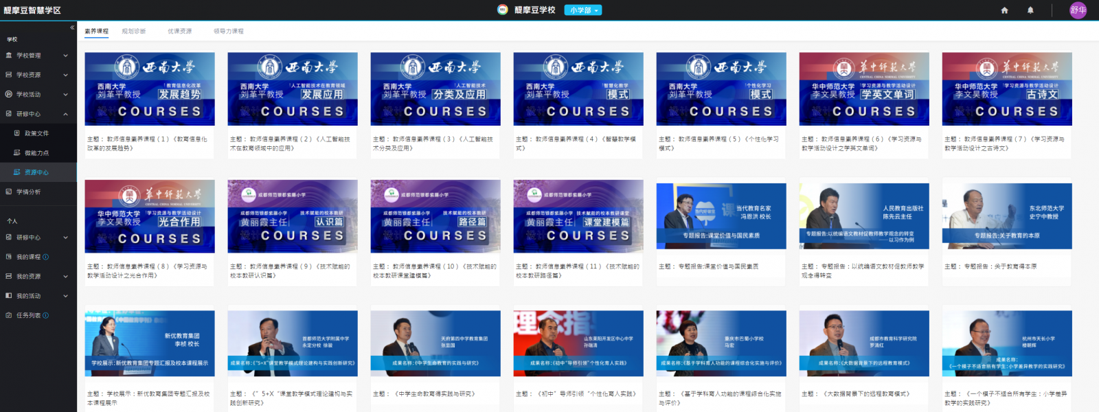 在“資源中心”板塊的“素養(yǎng)課程”欄目,老師可以聆聽專家的專題講座,提升自身信息化教育素養(yǎng),深刻認識現(xiàn)代信息技術與學科教學融合的重要性;在“優(yōu)課資源”欄目,可以觀摩優(yōu)秀的智慧教學案例,取其所長,學以致用,提升課堂教學能力;“領導力課程”板塊的專家由知名校長和著名教育領域專家組成,具備豐富的領導實踐經(jīng)驗,在這里,可以學習名校領導如何打造極具創(chuàng)新及進取精神的教師團隊,如何用信息技術賦能學校管理。