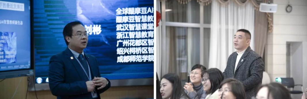 全球醍摩豆AI智慧學(xué)校聯(lián)盟秘書長劉彬校長對本次活動進(jìn)行了全程指導(dǎo),展示課結(jié)束后,劉校長給我們帶來了《基于數(shù)字化的精準(zhǔn)教學(xué)課例研究與AI智慧教研新生態(tài)》專題講座,劉校長運(yùn)用智慧教學(xué)的手段,與在座教師頻頻互動,同時(shí)圍繞三個(gè)問題:不忘本來,吸收外來,面向未來?扁平化的“智慧眾籌”式的教研創(chuàng)生智慧?技術(shù)賦能下的“學(xué)與教”變革思考?向教師們講解了“智慧課堂”和“智慧教研”。 劉彬校長從三條基本原則、四個(gè)結(jié)合應(yīng)用點(diǎn)、技術(shù)賦能合作學(xué)習(xí)三個(gè)方向著重講解了技術(shù)賦能下的教學(xué)思考,老師們可以通過二次作答、差異推送、作品分享、智慧助教將信息化工具與合作學(xué)習(xí)緊密聯(lián)系,用技術(shù)為教育教學(xué)服務(wù),提升教學(xué)效果。