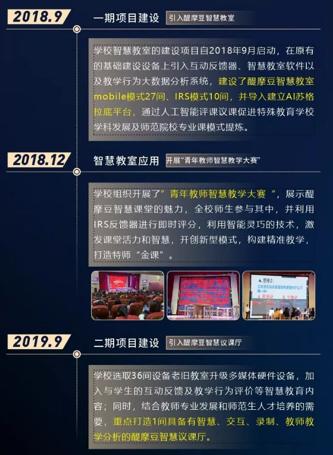 目前,學(xué)校已經(jīng)建設(shè)醍摩豆智慧教室mobile模式63間、IRS模式10間,并導(dǎo)入建立AI蘇格拉底平臺。同時,結(jié)合教師專業(yè)發(fā)展和師范生人才培養(yǎng)的需要,重點(diǎn)打造了1間具備有智慧、交互、錄制、教師教學(xué)分析的醍摩豆智慧議課廳。學(xué)校關(guān)注特殊教育及師范教育,在已有的建設(shè)基礎(chǔ)上,組織開展教師信息技術(shù)教學(xué)競賽,全面提高教育教學(xué)質(zhì)量。