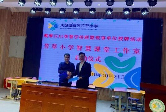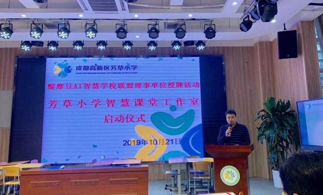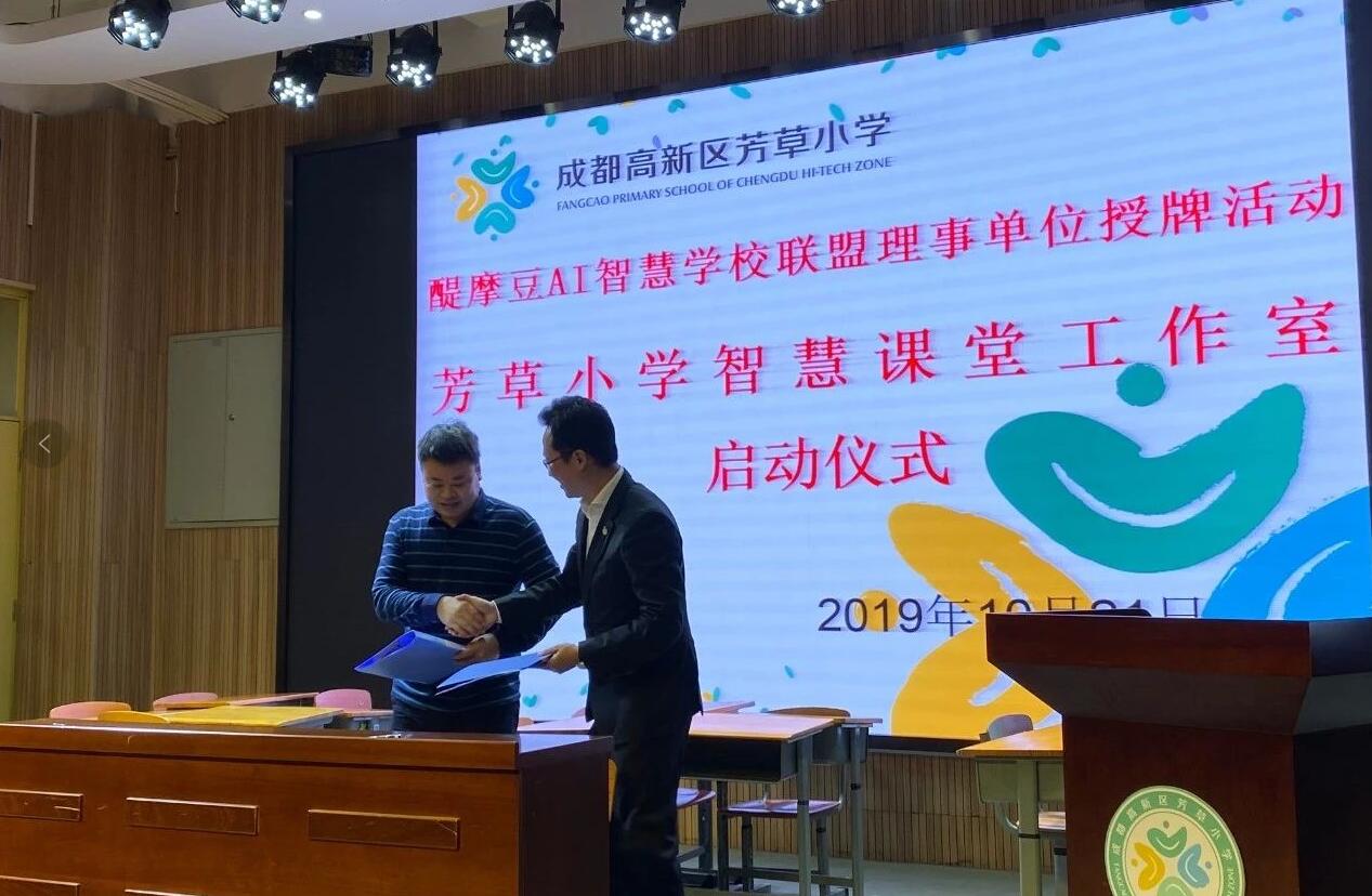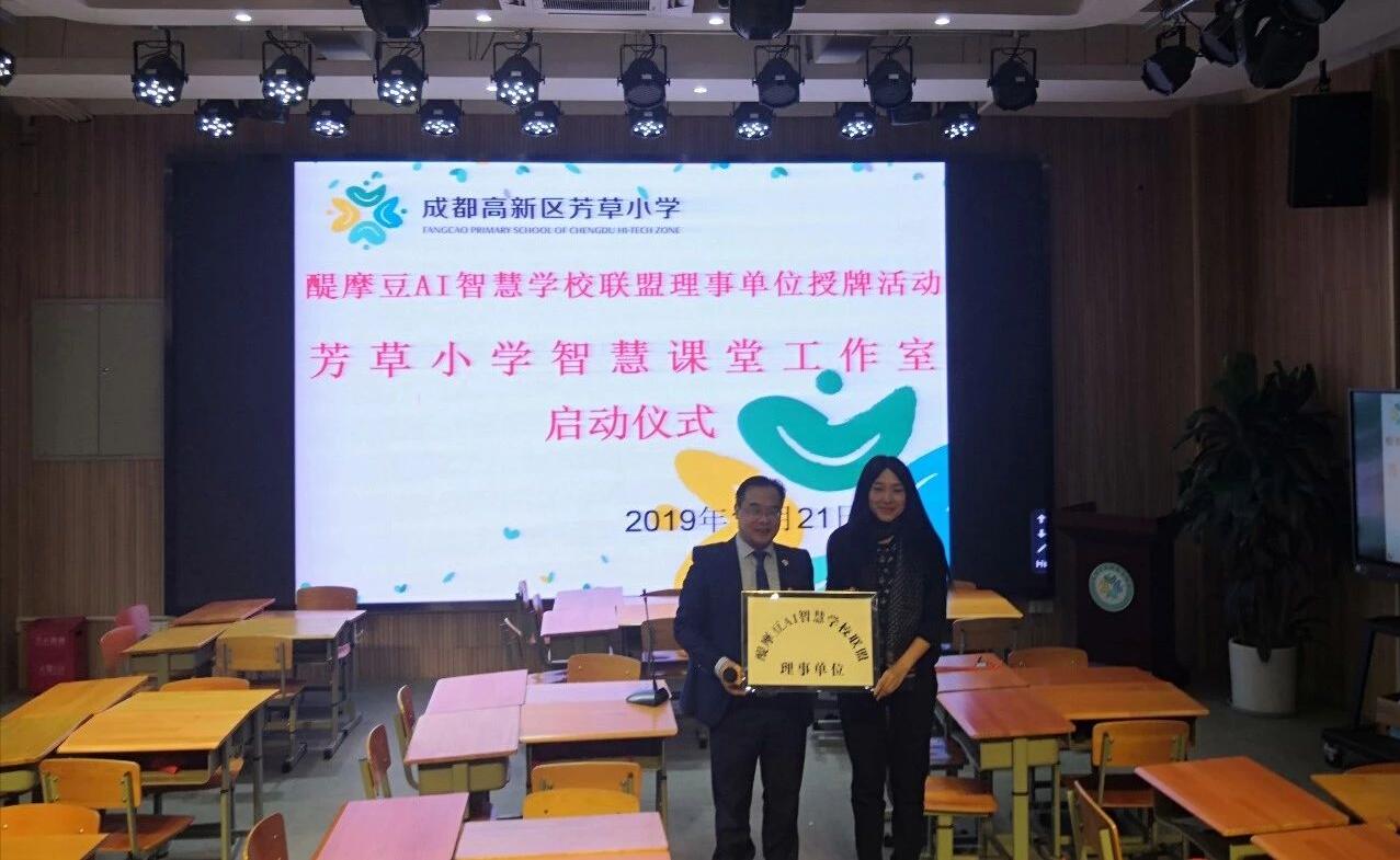 緊接著,由全球醍摩豆智慧教育研究院秘書長劉彬就構建全球醍摩豆AI智慧學校聯(lián)盟發(fā)展新生態(tài)作了介紹。劉彬秘書長介紹了芳草小學成為醍摩豆AI智慧學校理事單位后的相應權益,并從“強校聯(lián)盟 名家匯聚——學術引領;把握趨勢 凝聚智慧——資源共享;建模擴散 加速發(fā)展——合作交流”三個方面就“構建全球性智慧教育生態(tài)合作體系”作了闡釋。隨后,劉彬秘書長親自授牌成都高新區(qū)芳草小學“醍摩豆AI智慧學校聯(lián)盟理事單位”牌匾。