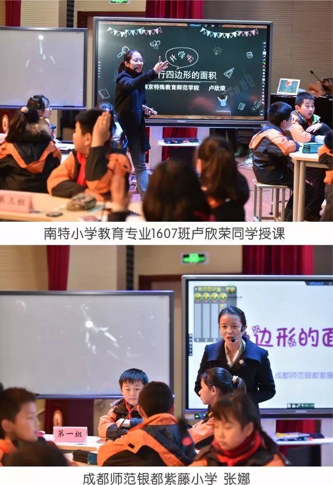“同課異構(gòu)”與“智慧課堂”是此次活動的兩大特色。特殊教育學院小學教育專業(yè)1607班盧欣榮同學和成都市天府新區(qū)優(yōu)秀班主任、成都師范銀都紫藤小學張娜老師先后登上講臺,圍繞蘇教版五年級的《平行四邊形的面積》這一教學內(nèi)容,進行互動教學展示。