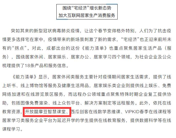 國家發(fā)展改革委:《成都新經(jīng)濟企業(yè)疫情防控能力清單》2月5日面向全社會發(fā)布,共計各類信息111條,涵蓋物資供應(yīng)、輿情傳播、物流運輸、遠程診療、教育文娛等各個行業(yè)領(lǐng)域。在圍繞“宅經(jīng)濟”增長新態(tài)勢加大互聯(lián)網(wǎng)居家生產(chǎn)消費服務(wù)板塊提到“此外,依托在線教育資源,開放醍摩豆智慧課堂等居家學(xué)習(xí)類服務(wù)企業(yè)平臺為延遲開學(xué)的學(xué)生提供在線教育服務(wù),提供數(shù)據(jù)科學(xué)等在線課程學(xué)習(xí)。”