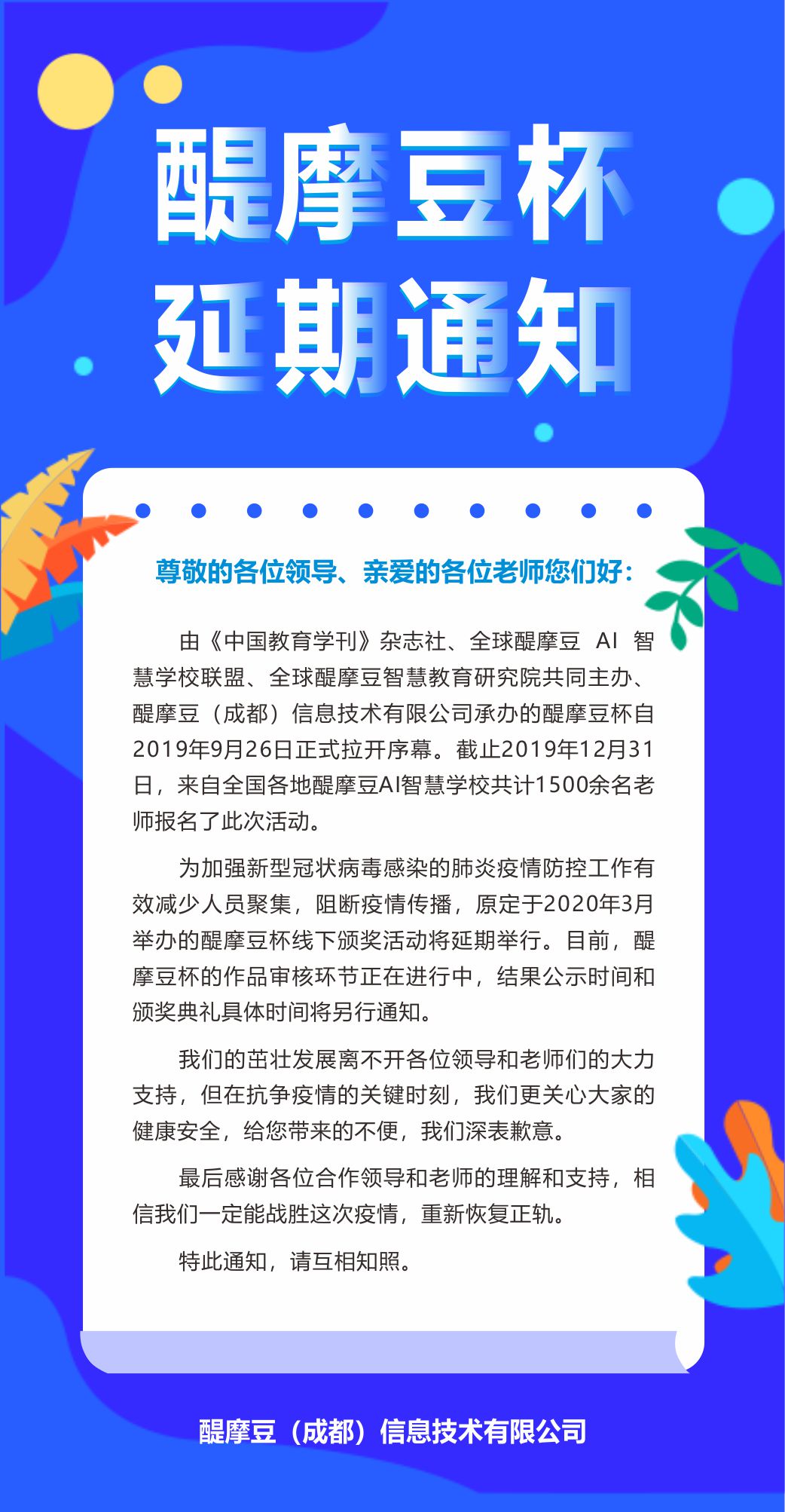 為加強新型冠狀病毒感染的肺炎疫情防控工作有效減少人員聚集,阻斷疫情傳播,原定于2020年3月舉辦的醍摩豆杯線下頒獎活動將延期舉行。目前,醍摩豆杯的作品審核正在進行中,結(jié)果公示時間和頒獎典禮具體時間將另行通知?,F(xiàn)通知如下: