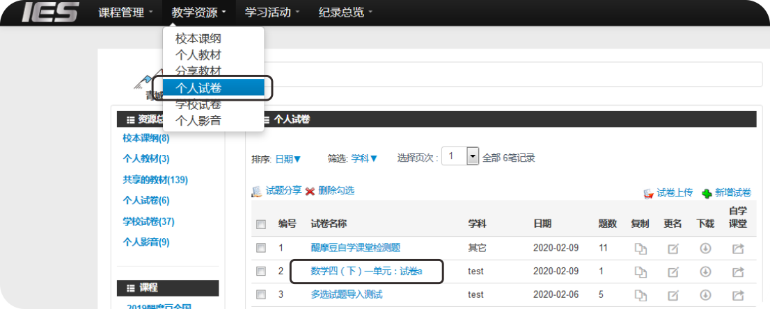 1、點(diǎn)擊 教學(xué)資源 → 個人試卷 ,點(diǎn)擊試卷。(例:數(shù)學(xué)四下 一單元: 試卷a)