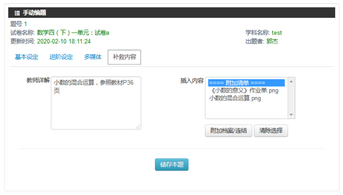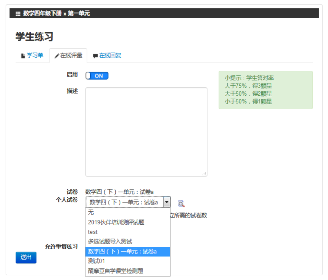 前提:根據(jù)課程四,已建立了個人試卷:數(shù)學(xué)四(下)一單元: 試卷a。