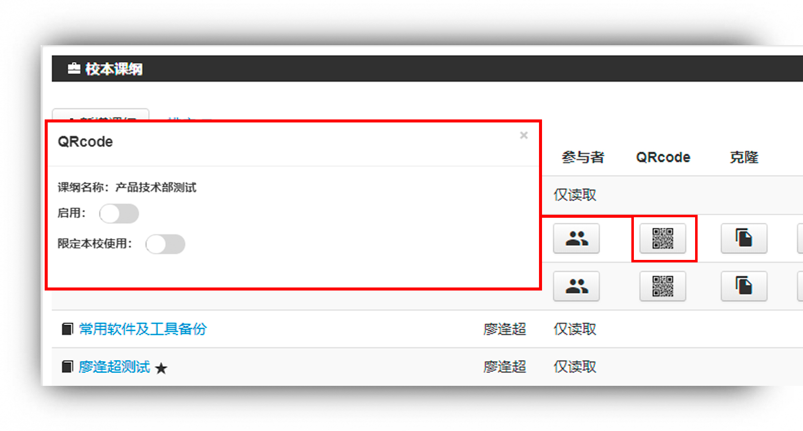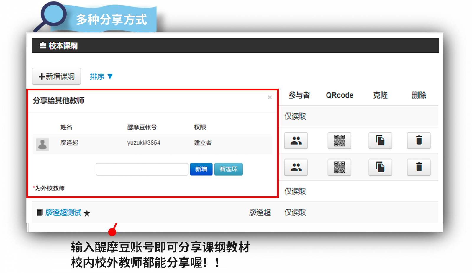 建立好的課綱可以分享給校內(nèi)的老師,課綱擁有者只要選擇校內(nèi)預(yù)計(jì)分享的其他老師醍摩豆賬號(hào),即可自主完成分享。此外,如果需要分享給很多人,則可以利用QRcode掃碼分享的方式來(lái)進(jìn)行,取得QRcode的老師,只要利用手機(jī)HiTA app掃碼,即可完成分享,不論校內(nèi)、校外教師伙伴皆可利用此方法取得分享,更方便快速。