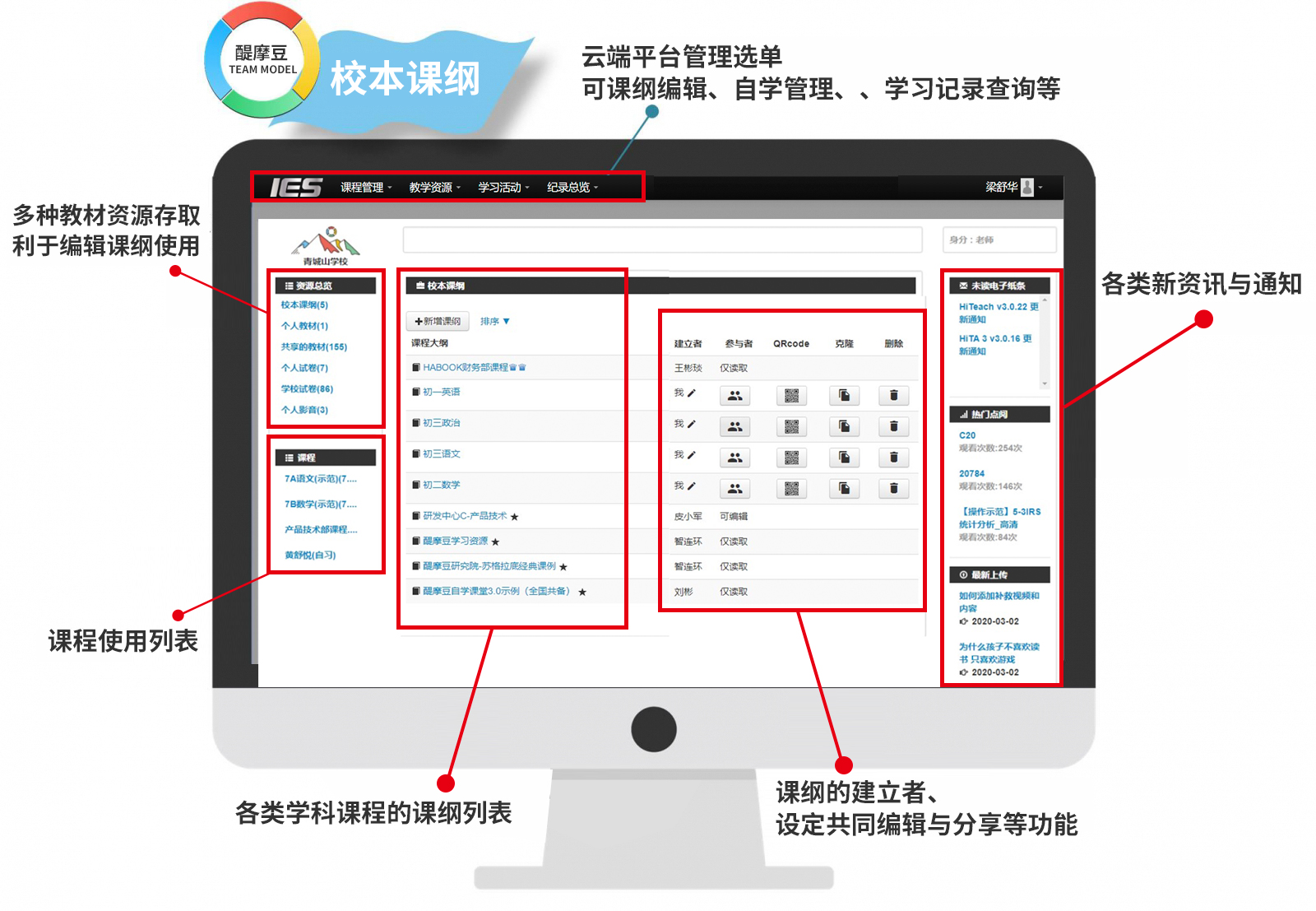 備課,是每一位老師日常工作的重點(diǎn)之一。因此,如何利用云端技術(shù),把備課云端化,讓老師結(jié)構(gòu)化備課,便利存取,并能夠在智慧教室的環(huán)境中隨取即用,同時(shí)滿足在線、線下的教與學(xué)需求,就需要一個(gè)好的支持系統(tǒng)來(lái)協(xié)助。醍摩豆云平臺(tái)的IES智慧教學(xué)服務(wù),就提供了「校本課綱」功能,幫助老師做好備課工作。