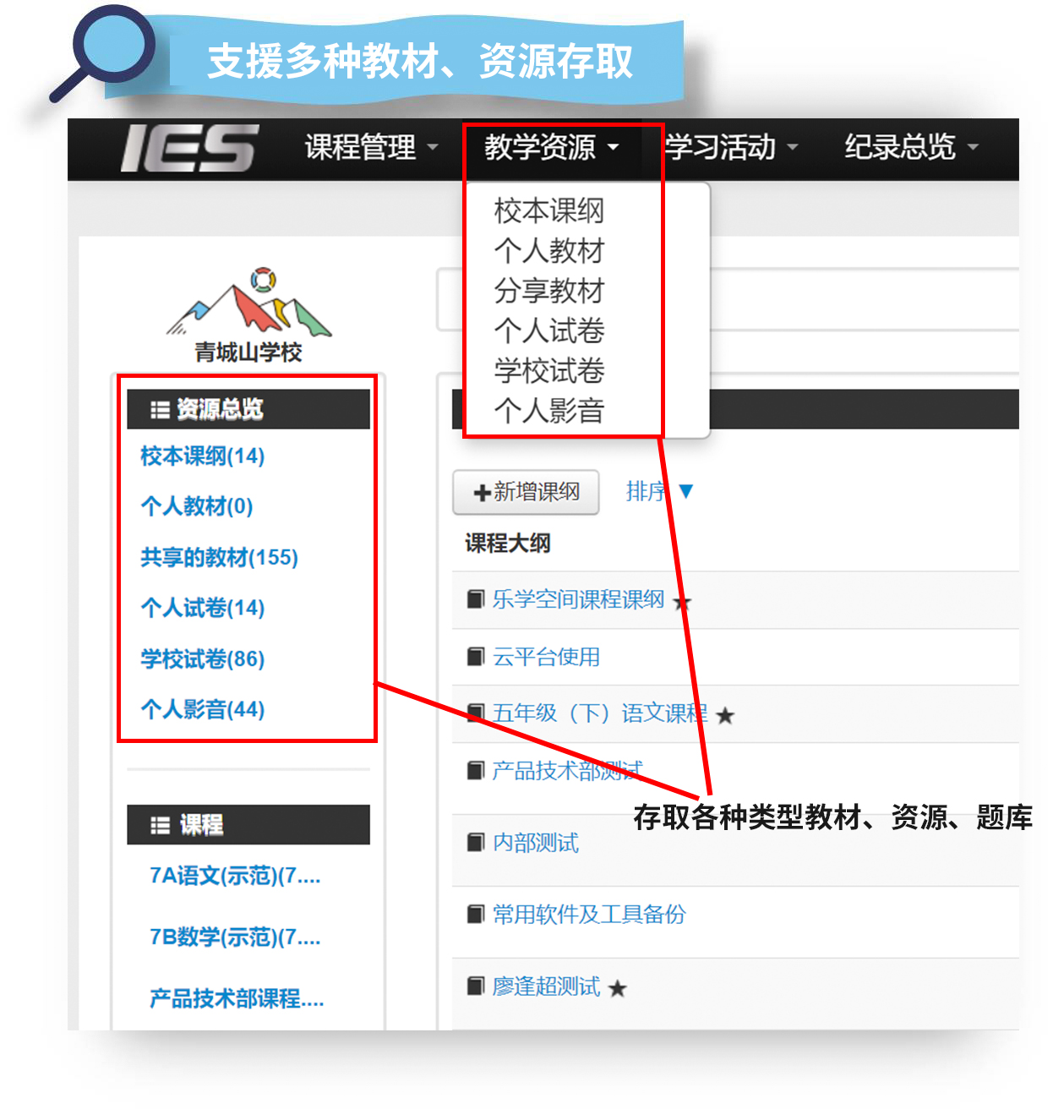 在IES平臺(tái)上,教師可上傳各類教材資源(多種格式檔案、影音、題庫(kù)等),方便教師在校本課綱中備課時(shí)即可安排使用。