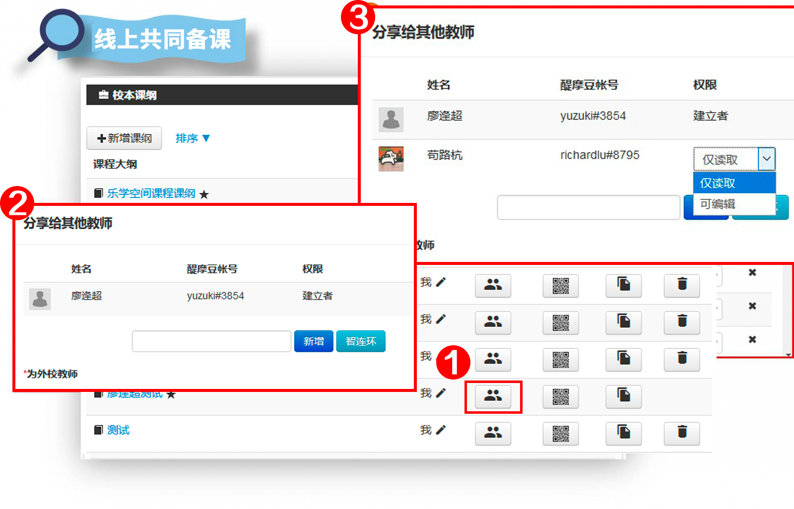 校本課綱的分享功能可以設(shè)定權(quán)限,包括僅讀取、可編輯等權(quán)限,當(dāng)選擇可編輯的權(quán)限時(shí),被分享者即可和其他教師伙伴共同備課及教學(xué)應(yīng)用。