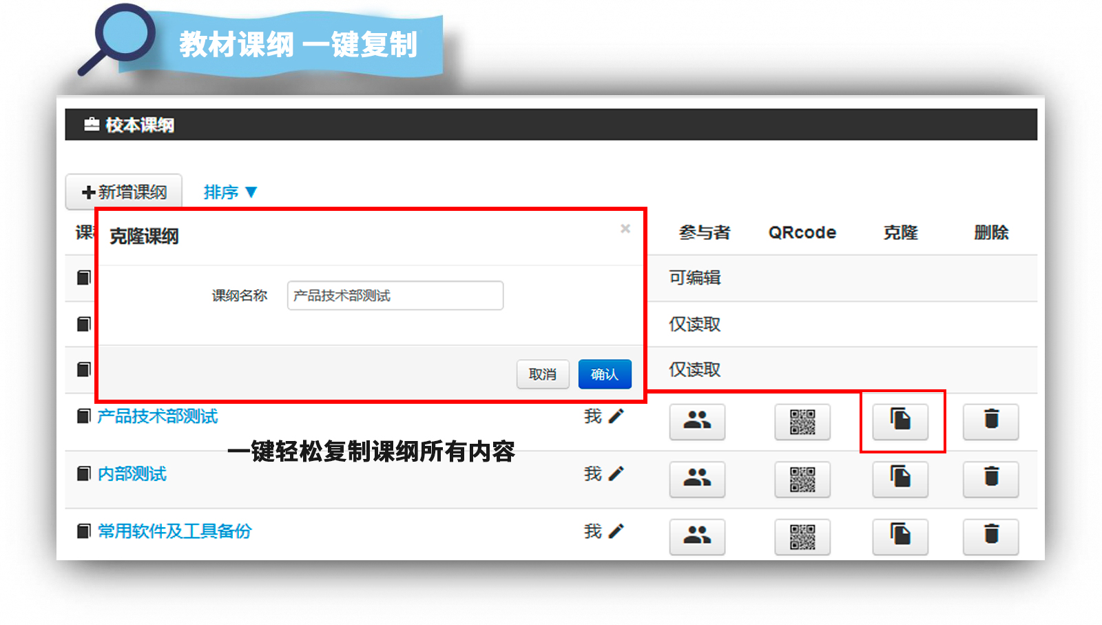 校本課綱教材內(nèi)容可輕松一鍵復(fù)制,讓復(fù)制的課綱可以做其他的修改或延伸使用,又不影響到原課綱里的內(nèi)容,讓教材的使用有更多的彈性。此外,亦可將課綱的所有權(quán)移轉(zhuǎn)給其他醍摩豆賬號(hào),讓被移轉(zhuǎn)的新?lián)碛姓咦灾鞴芾怼?/span>