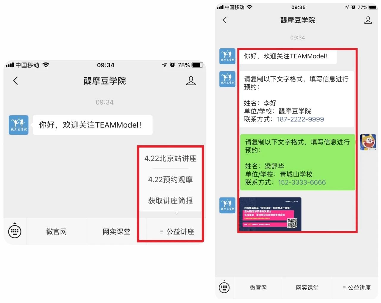 2、點擊菜單欄中“公益講座”點擊“4.22預約觀摩”根據(jù)提示填寫相關(guān)信息即可獲得本次講座進群二維碼
