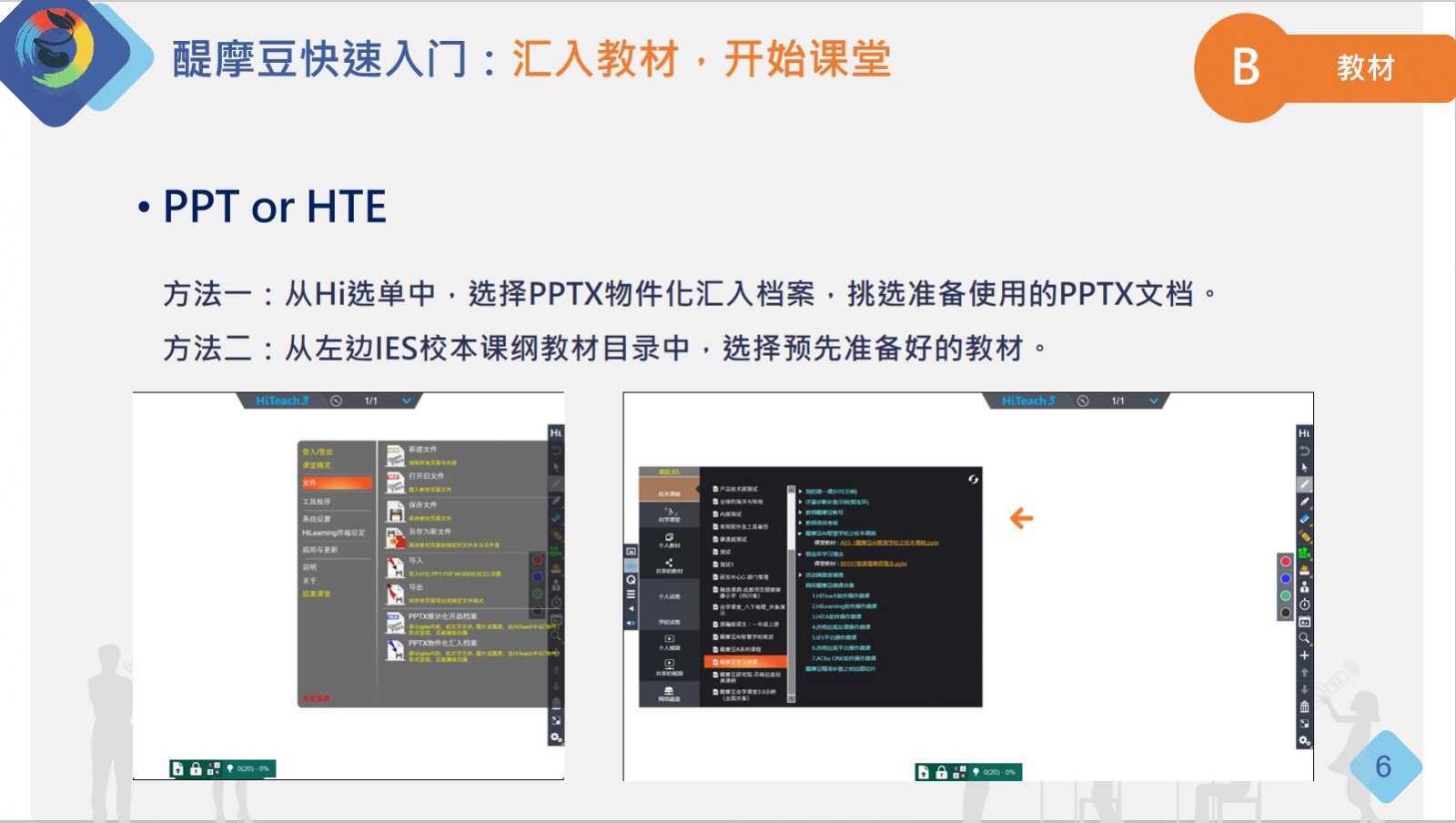 參考這份簡報,快速掌握醍摩豆HiTeach TBL的入門操作方法,包括 A.啟動課堂、B.匯入教材、C.平板使用、D.數(shù)據(jù)上傳等操作流程。