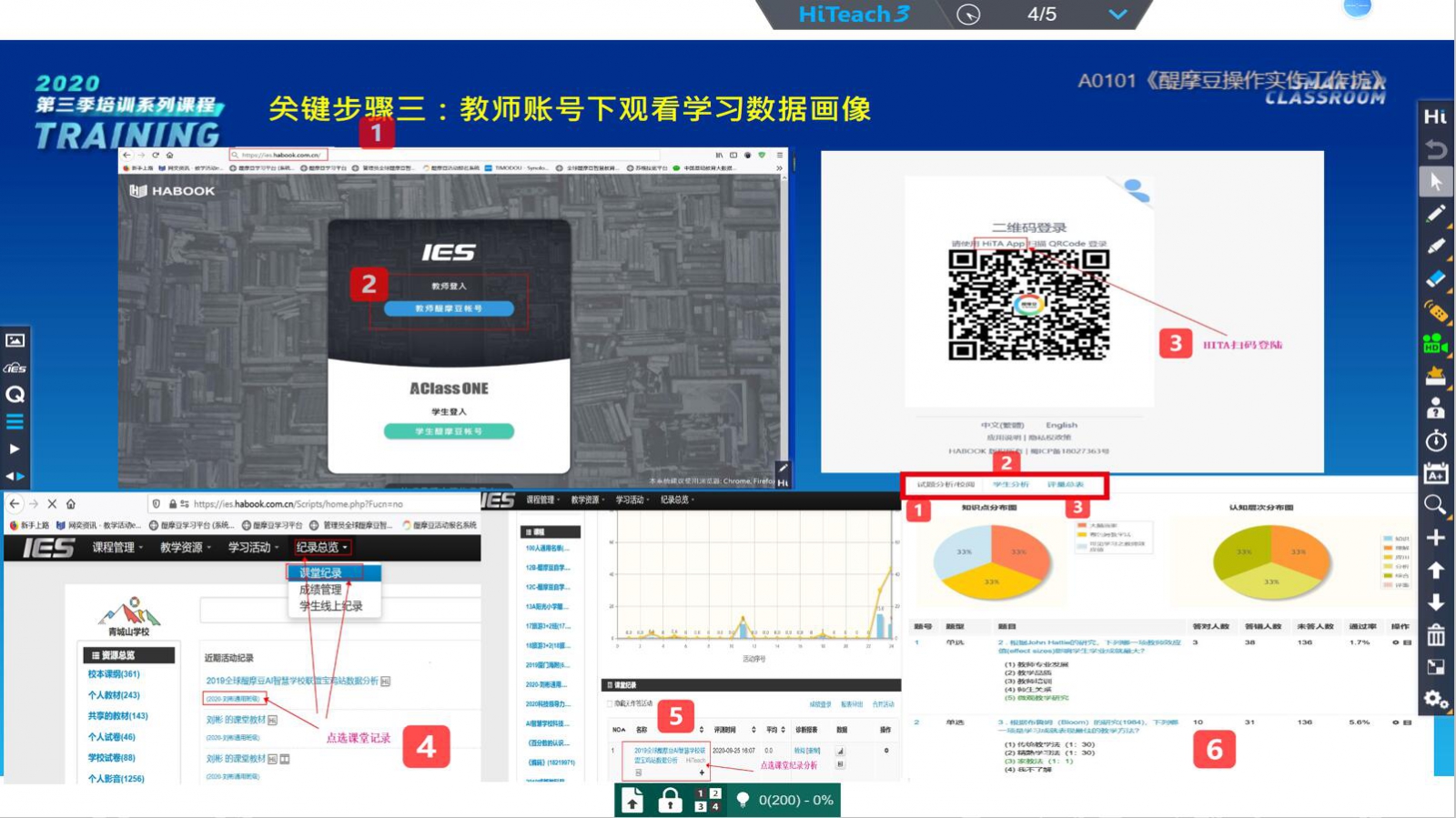 關鍵步驟三:教師登錄 ies.habook.com.cn,選擇教師賬號登陸后,點選上課班級課堂紀錄觀看學習數(shù)據(jù)(試題分析、學生分析、評量總覽),教師可以進行精準有效的課堂學習診斷分析。