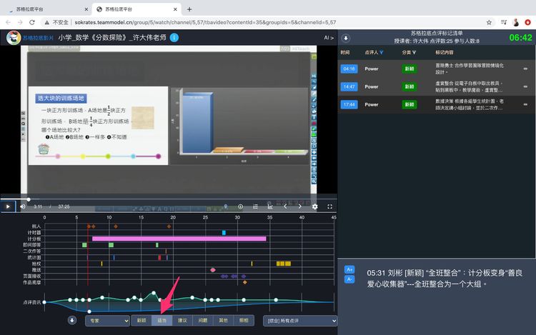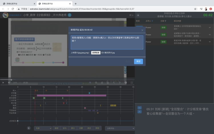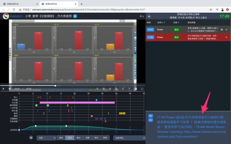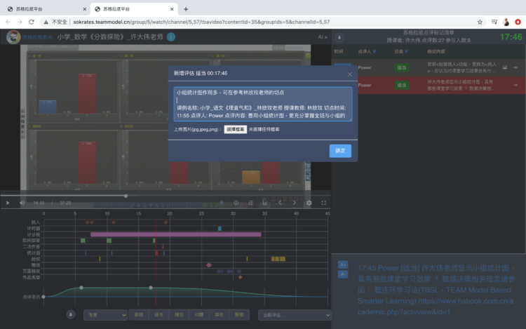 蘇格拉底影片播放到17:46,選擇點(diǎn)評(píng)類型:適當(dāng),輸入點(diǎn)評(píng)切點(diǎn)鏈接(圖七)。顯示點(diǎn)評(píng)播放清單,新增加的點(diǎn)評(píng)顯示在清單中(圖八)。自動(dòng)打開切點(diǎn)鏈接,播放另一課例的切片(圖九)。