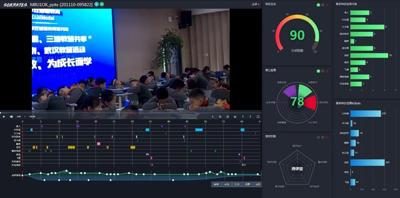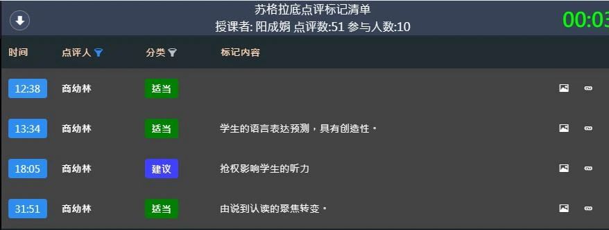 在智慧課堂教學(xué)過(guò)程中,陽(yáng)老師運(yùn)用HiTeach智慧教學(xué)系統(tǒng)的即問(wèn)即答,智慧挑人,作品觀(guān)摩、倒計(jì)時(shí)、搶權(quán)等功能和課堂高度融合,引導(dǎo)孩子們主動(dòng)思考,積極互動(dòng),合作學(xué)習(xí),展現(xiàn)了一堂以生為本的高互動(dòng)智慧課。同時(shí),成都、武漢、北京三地的專(zhuān)家通過(guò)蘇格拉底議課系統(tǒng),隨時(shí)隨地打點(diǎn)標(biāo)記。 智慧教研