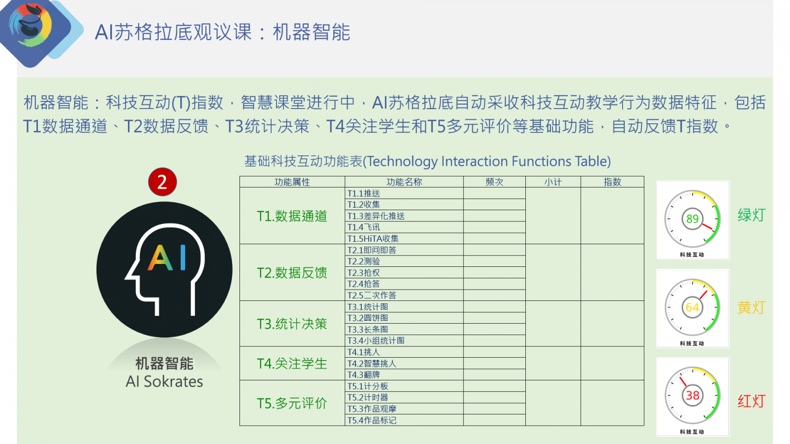 科技互動(T)指數(shù)分為五類分析指標,包括T1.數(shù)據(jù)通道、T2.數(shù)據(jù)反饋、T3.統(tǒng)計決策、T4.關(guān)注學(xué)生和T5.多元評價等基礎(chǔ)互動功能分項,統(tǒng)計分析每一分項之頻次與有效組合應(yīng)用,并給出分項指數(shù)和總指數(shù)??萍蓟又笖?shù)(0-99),70分以上為顯示為綠燈,50-70分黃燈,50分以下為紅燈。適當科技互動功能應(yīng)用組合,可獲得較高指數(shù),當科技互動指數(shù)顯示為綠燈時,表示這堂課之科技互動應(yīng)用達到熟練程度。