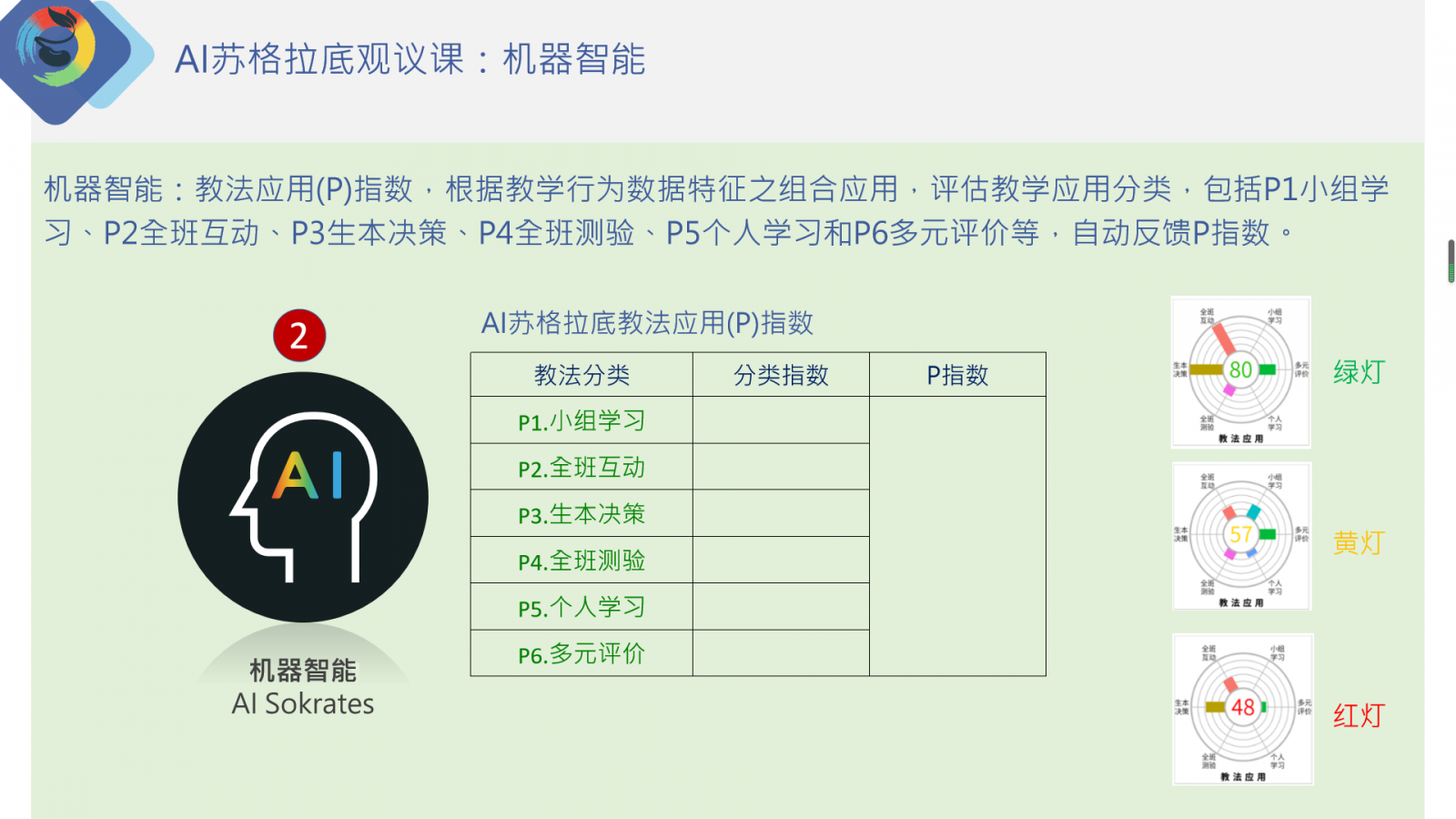 AI蘇格拉底教法應(yīng)用(P)指數(shù)有六項分析指數(shù),包括P1.小組學(xué)習(xí)、P2.全班互動、P3.生本決策、P4.全班測驗、P5.個人學(xué)習(xí)、P6.多元評價等。運用這六項指數(shù),評估教學(xué)行為數(shù)據(jù)特征的有效性,有效教學(xué)行為數(shù)據(jù)特征越多,可獲得越高指數(shù), 70分以上顯示為綠燈,50-70分黃燈,50分以下為紅燈。