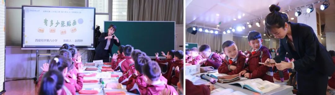 上午的課堂展示環(huán)節(jié),西安經(jīng)開第八小學趙雨婷老師帶來二年級數(shù)學《有多少張貼畫》,西安高新第十八小學郝淋老師帶來二年級英語《Does he play the piano?》,寶雞高新第三小學關(guān)樂老師帶來四年級語文《古詩三首》,三位教師圍繞“雙減”背景下智慧課堂的應用分別執(zhí)教了精彩的研討課,研討課以現(xiàn)場直播、線上線下相結(jié)合的方式呈現(xiàn)。
