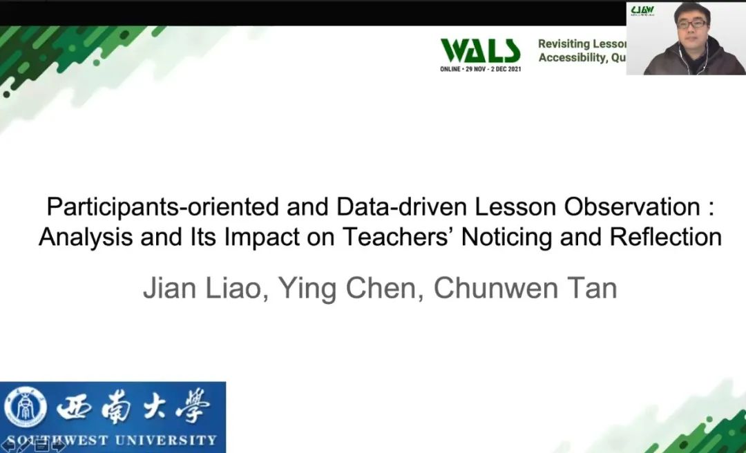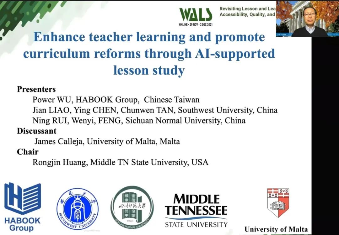 世界課堂研究學(xué)會第15次國際研討會(WALS 2021)于11月29-12月2日盛大舉行。分論壇以「透過AI人工智能加強(qiáng)教師學(xué)習(xí)促進(jìn)課程改革」為主題,由美國田納西州立大學(xué)課堂研究專家黃榮金教授主持。