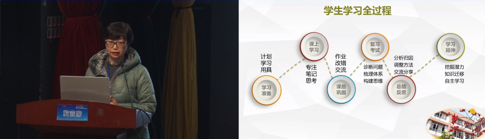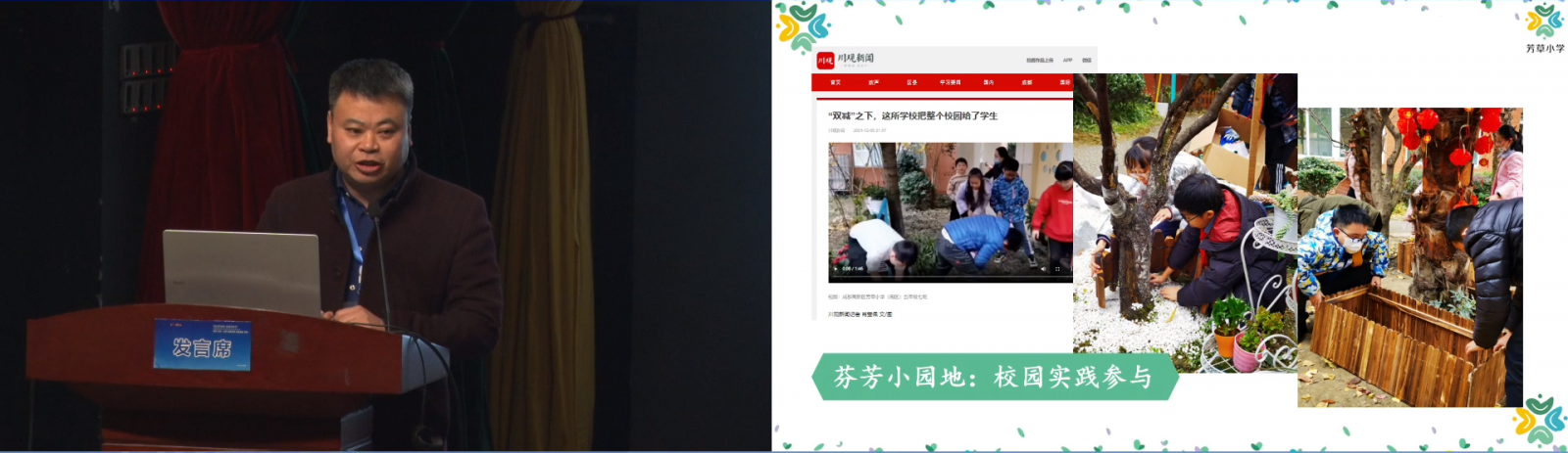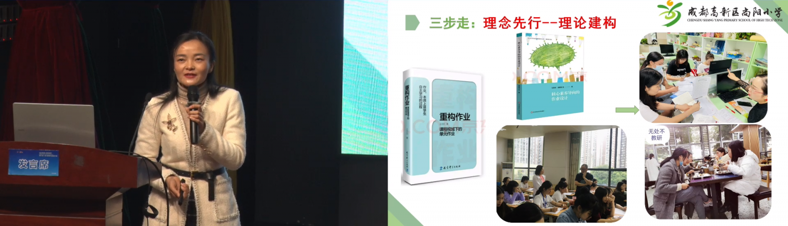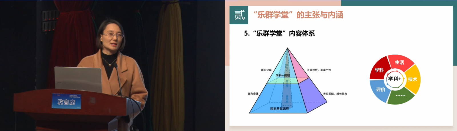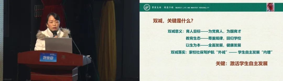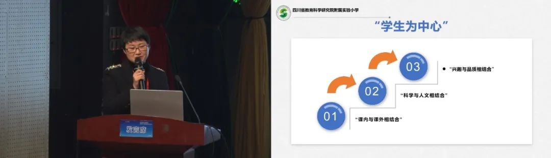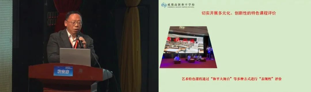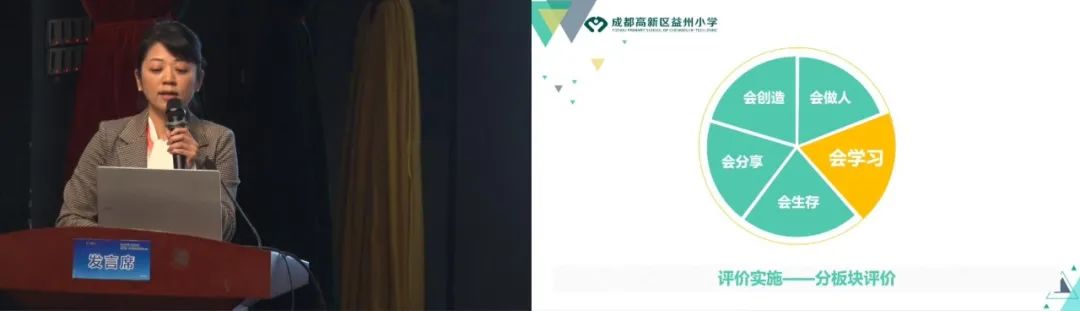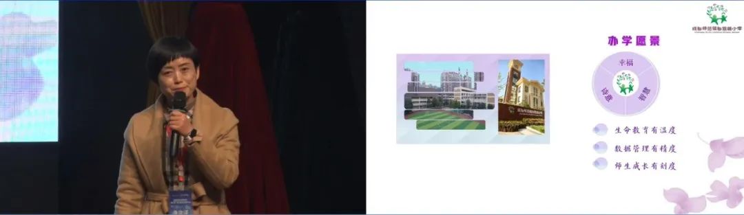 李雪梅校長(zhǎng)介紹錦城小學(xué)用“樂群教育”推動(dòng)雙減背景下的課堂變革,提出“優(yōu)美和樂、共同協(xié)作”的教育主張。