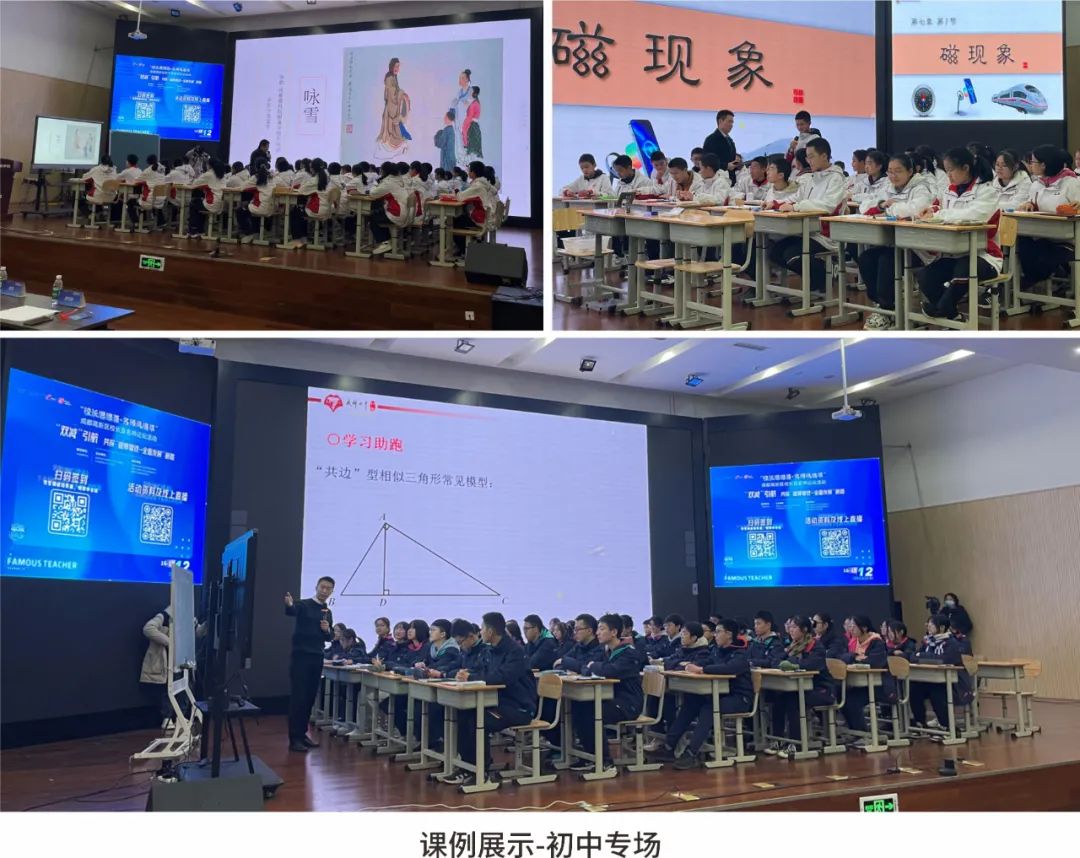 初中場(chǎng)由成都市教科院附屬學(xué)校岳國忠、成都七中初中學(xué)校何明、錦城一中歐林陽老師帶來語文《詠雪》、數(shù)學(xué)《有趣的“共邊”型相似三角形》、物理《磁現(xiàn)象》。