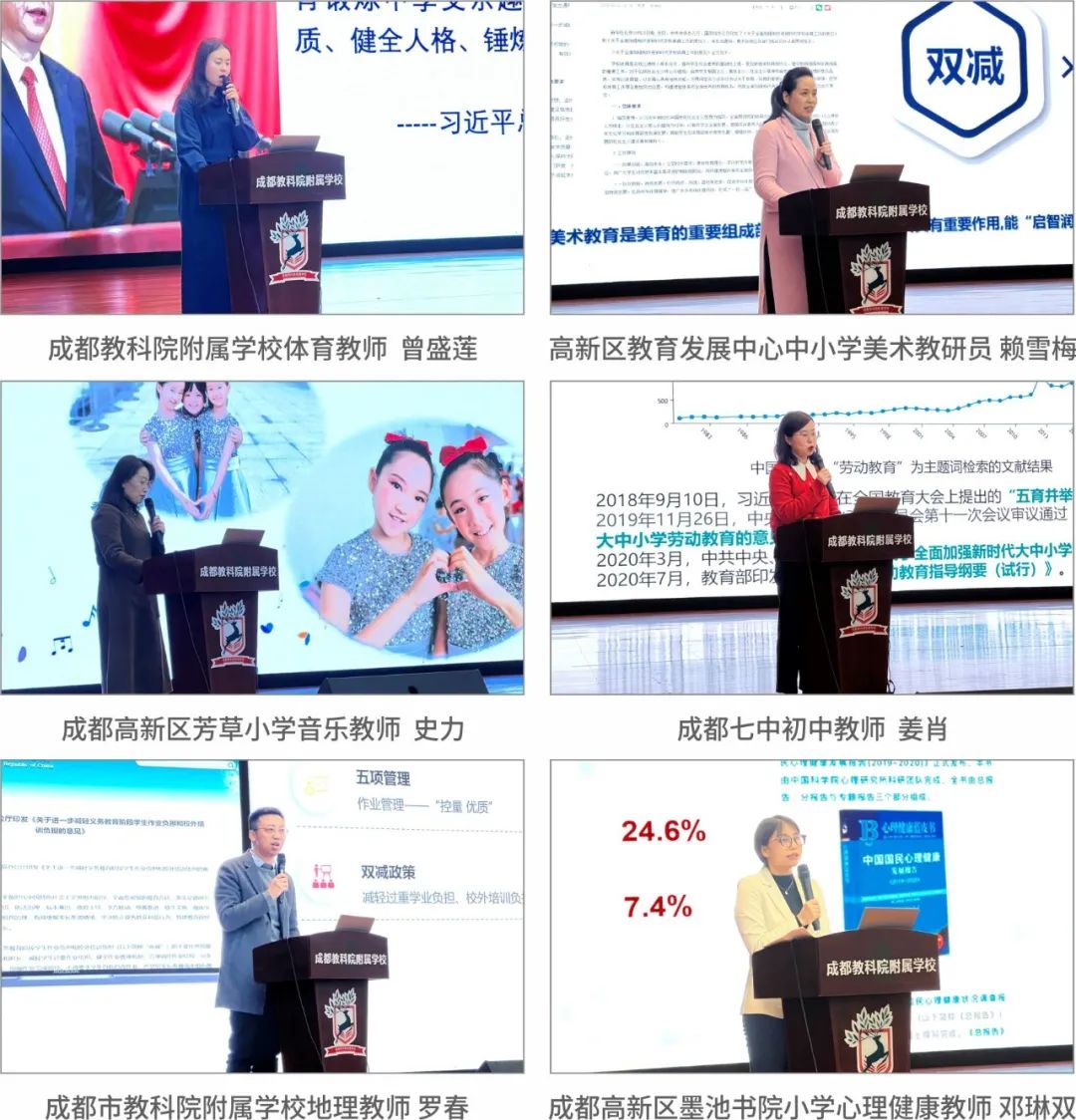 下午,成都教科院附屬學(xué)校體育教師曾盛蓮、高新區(qū)教育發(fā)展中心中小學(xué)美術(shù)教研員賴雪梅、成都高新區(qū)芳草小學(xué)音樂教師史力、成都七中初中教師姜肖、成都市教科院附屬學(xué)校地理教師羅春、成都高新區(qū)墨池書院小學(xué)心理健康教師鄧琳雙老師分別帶來題為《“以體育人·以體育心”——體育課程建設(shè)實(shí)踐》、《共建共享區(qū)域美育特色課程》、《學(xué)生合唱社團(tuán)的品質(zhì)建設(shè)之路》、《“農(nóng)耕+”勞動(dòng)教育特色課程構(gòu)建》、《聚焦核心素養(yǎng)培育的學(xué)生綜合實(shí)踐活動(dòng)課程構(gòu)建與實(shí)施》、《打造學(xué)生和諧心理空間》的專題匯報(bào),六位名師從德智體美勞及心育出發(fā),分享了一線老師的“雙減”經(jīng)驗(yàn)。