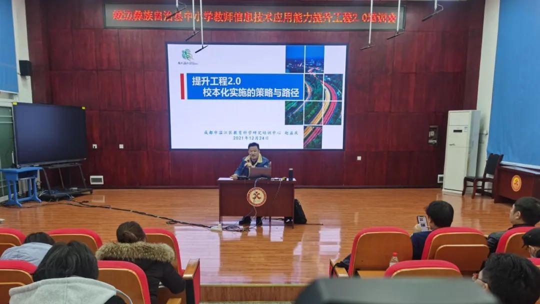 成都市溫江區(qū)提升工程2.0區(qū)級專家團隊首席專家趙益慶帶來《提升工程2.0校本化實施的策略與路徑》的專題報告,他對中小學教師信息技術(shù)應(yīng)用能力提升工程2.0政策、提升工程2.0整校推進的五大任務(wù):開展團隊建設(shè)、制定規(guī)劃方案、選擇微能力、組織校本研修、實施校本考核作了詳細的講解,并對整校推進的實施路徑、微能力點等方面進行了深度解析。
