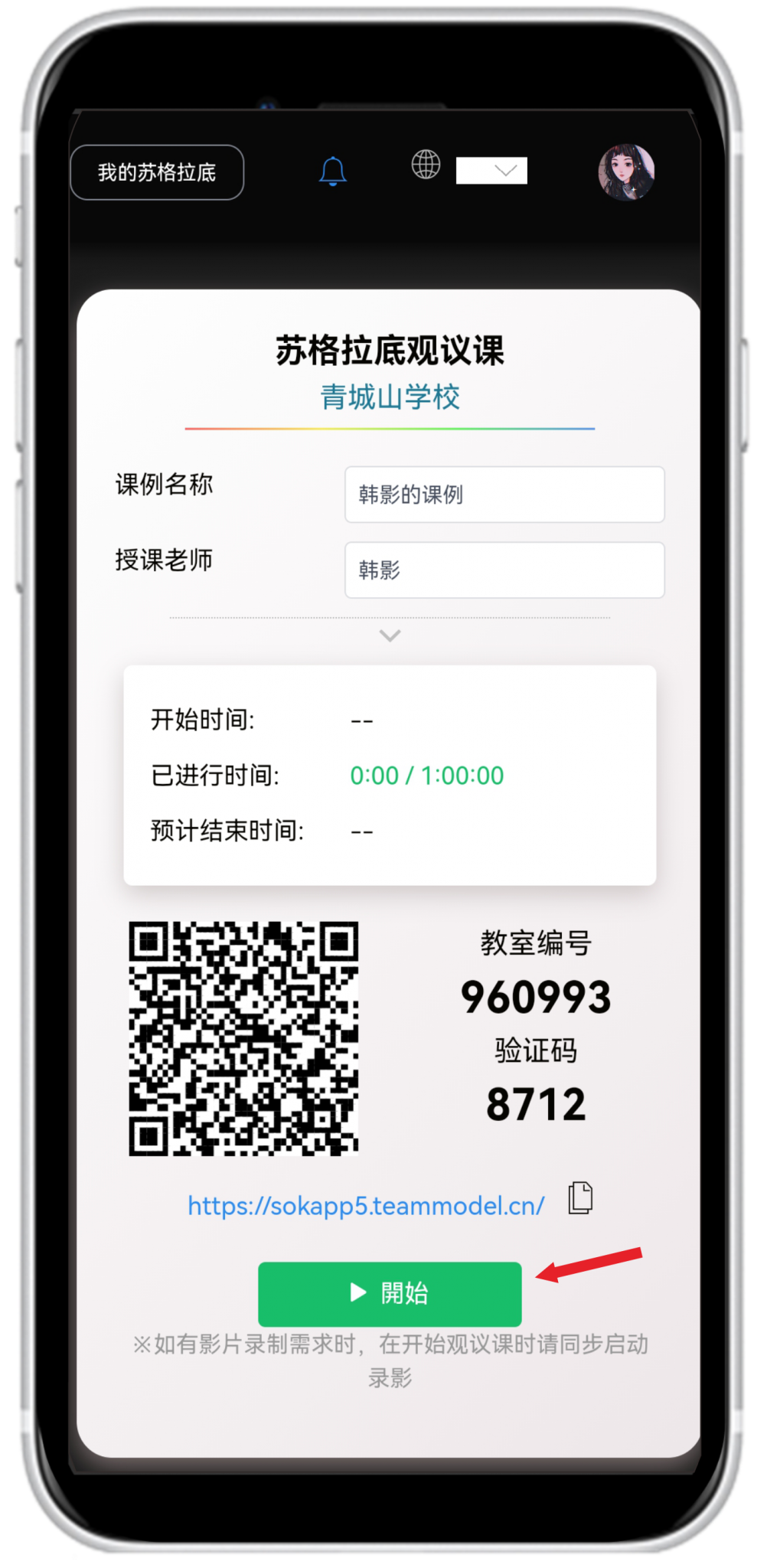 步驟四:顯示通用型觀議課開始畫面后,按下開始鈕就可以開始同步觀議課,如圖5。參與者也可使用HiTA 5 APP掃碼加入同步觀議課教室。