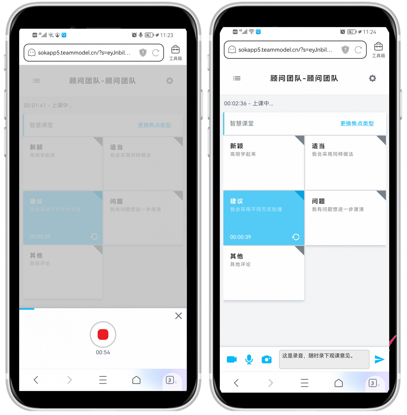 顯示蘇格拉底議課APP后,就可以輸入觀課標記,標記類型有文字、照片、錄音和錄像等,圖8是輸入文字畫面示例,圖9是輸入照片畫面示例,圖10是錄音畫面示例,圖11是錄像畫面示例。