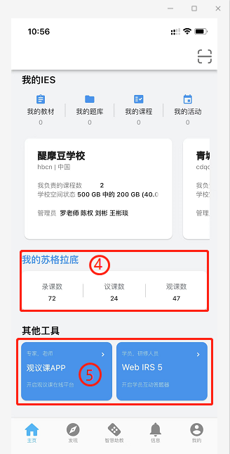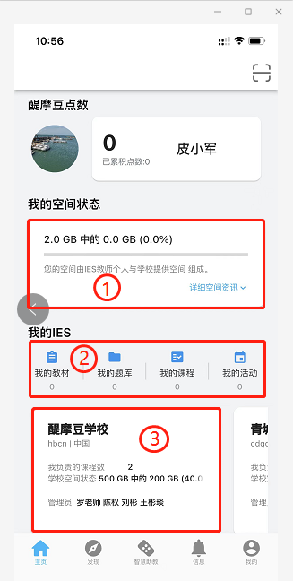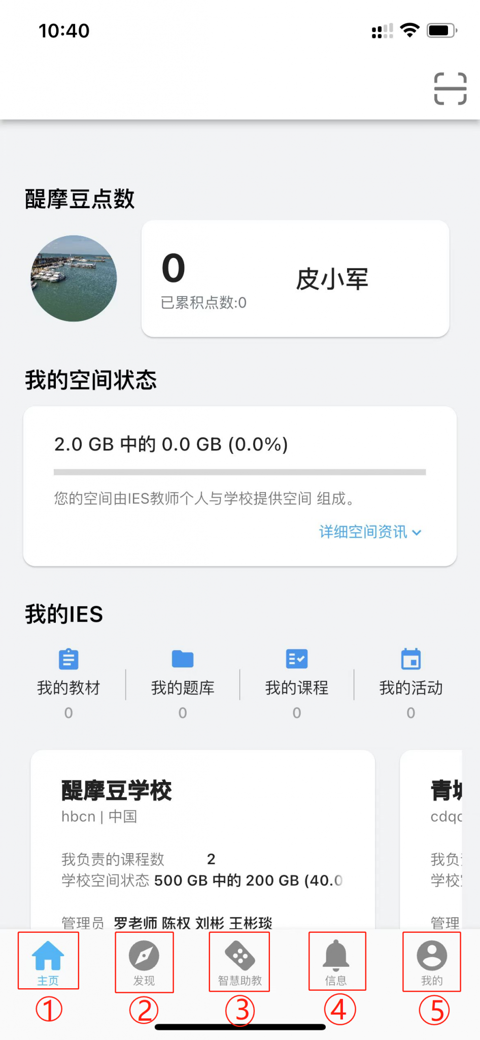 一、界面: ① 主頁: 可預(yù)覽醍摩豆賬戶權(quán)益, 包含點數(shù), 云端空間狀態(tài), IES云端智慧教育平臺,蘇格拉底教研活動以及跳轉(zhuǎn)觀議課和參與互動