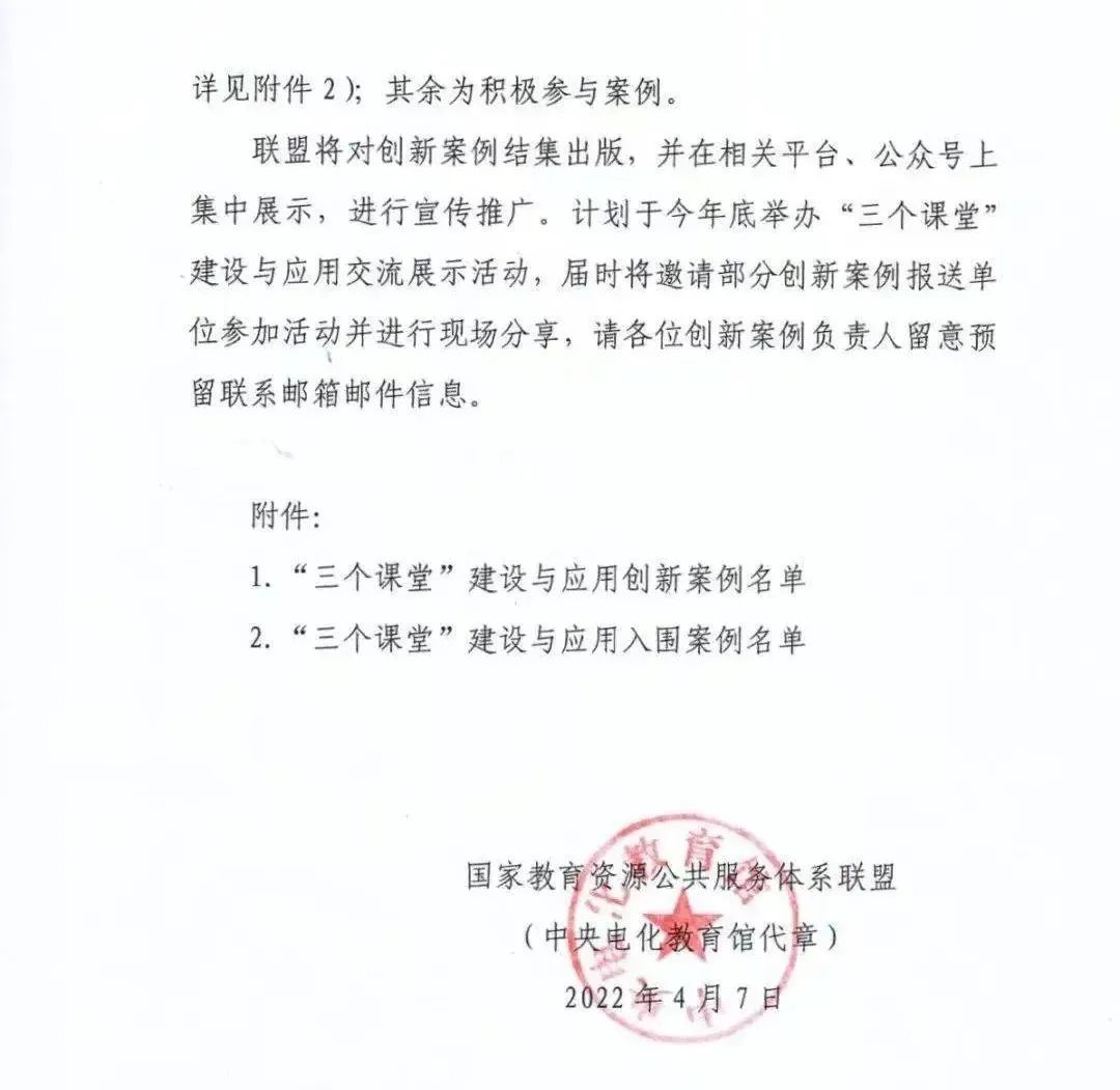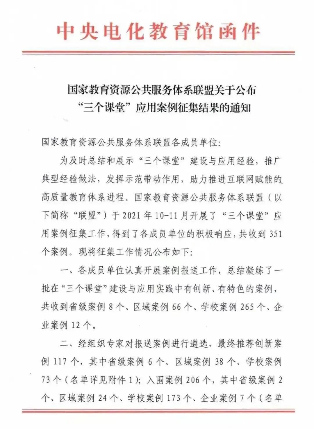 為及時總結和展示“三個課堂”的建設與應用經(jīng)驗,推廣典型經(jīng)驗做法,發(fā)揮領頭示范帶動作用,助力推進互聯(lián)網(wǎng)賦能的高質(zhì)量教育體系進程。國家教育資源公共服務體系聯(lián)盟于2021年10月至11月開展了“三個課堂”應用案例征集工作。