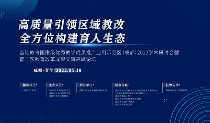 為了強(qiáng)化“基礎(chǔ)教育國(guó)家級(jí)優(yōu)秀教學(xué)成果推廣應(yīng)用示范區(qū)”責(zé)任擔(dān)當(dāng),凝煉典型經(jīng)驗(yàn),建設(shè)聯(lián)動(dòng)機(jī)制,搭建交流平臺(tái)。2022年5月19日,基礎(chǔ)教育國(guó)家級(jí)優(yōu)秀教學(xué)成果推廣應(yīng)用示范區(qū)(成都)2022學(xué)術(shù)研討會(huì)暨青羊區(qū)教育改革成果交流高峰論壇在青羊區(qū)教育科學(xué)研究院盛大舉行。