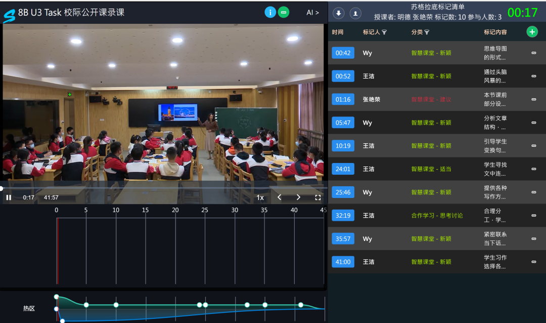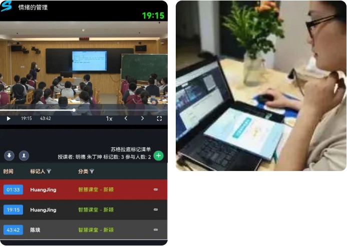 一個一個綠色的標(biāo)記表示觀課老師對這個節(jié)課的高度關(guān)注及好評,蘇格拉底影片將每一個標(biāo)記都清晰的記錄在影片的右側(cè),同時影片底部的小圓點也將右側(cè)的建議對應(yīng)到課堂的時間軸,讓每一個建議和點評都有跡可循。