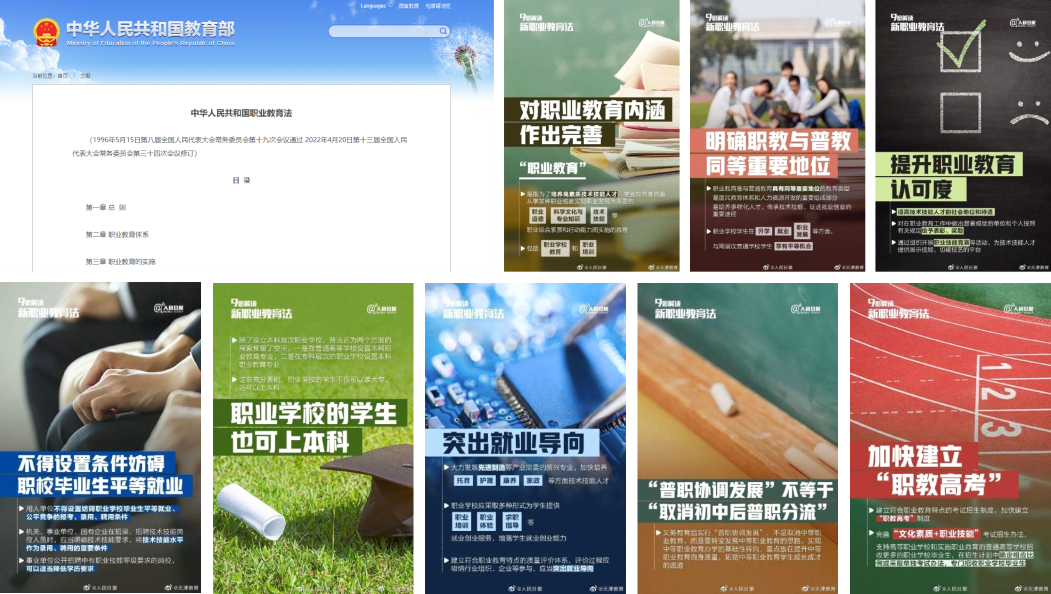 4月20日,十三屆全國人大常委會第三十四次會議表決通過新修訂的職業(yè)教育法,將從2022年5月1日起施行。這是該法自1996年頒布施行以來的首次大修。新版職業(yè)教育法明確提出:支持運用信息技術(shù)和其他現(xiàn)代化教學方式,開發(fā)職業(yè)教育網(wǎng)絡課程等學習資源,創(chuàng)新教學方式和學校管理方式,推動職業(yè)教育信息化建設與融合應用。
