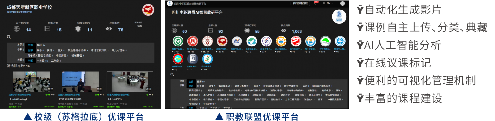 優(yōu)質(zhì)課程建設、教學資源庫開發(fā)是當前職業(yè)教育中的重點建設項目。推進職業(yè)教育數(shù)字化轉(zhuǎn)型升級需要堅持內(nèi)容為王,持續(xù)豐富資源。課程建設是實現(xiàn)職業(yè)學校學生培養(yǎng)目標的基地,課程建設水平直接關系到學生質(zhì)量和職業(yè)能力,課程建設的重點依靠師資建設和教學評價改革。蘇格拉底優(yōu)課平臺就是學校教師專業(yè)發(fā)展影片的匯流平臺,是整合影片與數(shù)據(jù)的大平臺。