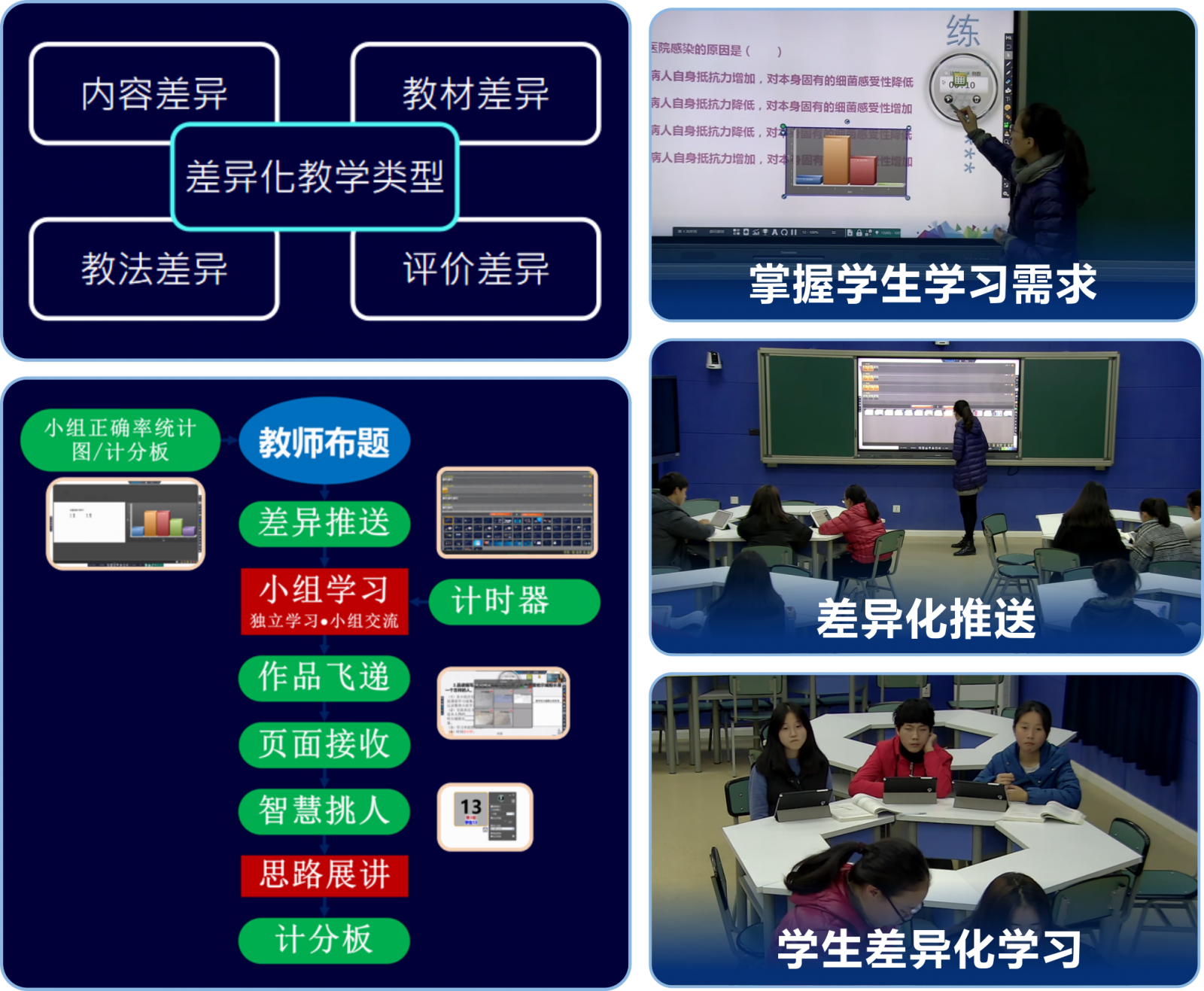 “因材施教”是指在教學中根據(jù)不同學生的認知水平、學習能力以及自身素質(zhì),教師選擇適合每個學生特點的學習方法來有針對性的教學,發(fā)揮學生的長處,彌補學生的不足,激發(fā)學生學習的興趣,樹立學生學習的信心,從而促進學生全面發(fā)展。醍摩豆智慧教室的差異推送功能完美幫助老師課堂上因材施教的難題,老師根據(jù)數(shù)據(jù)統(tǒng)計掌握學情,并根據(jù)學情分組精準推送教學任務,學生會收到滿足自己學習需求的不同教材,實現(xiàn)差異化學習。