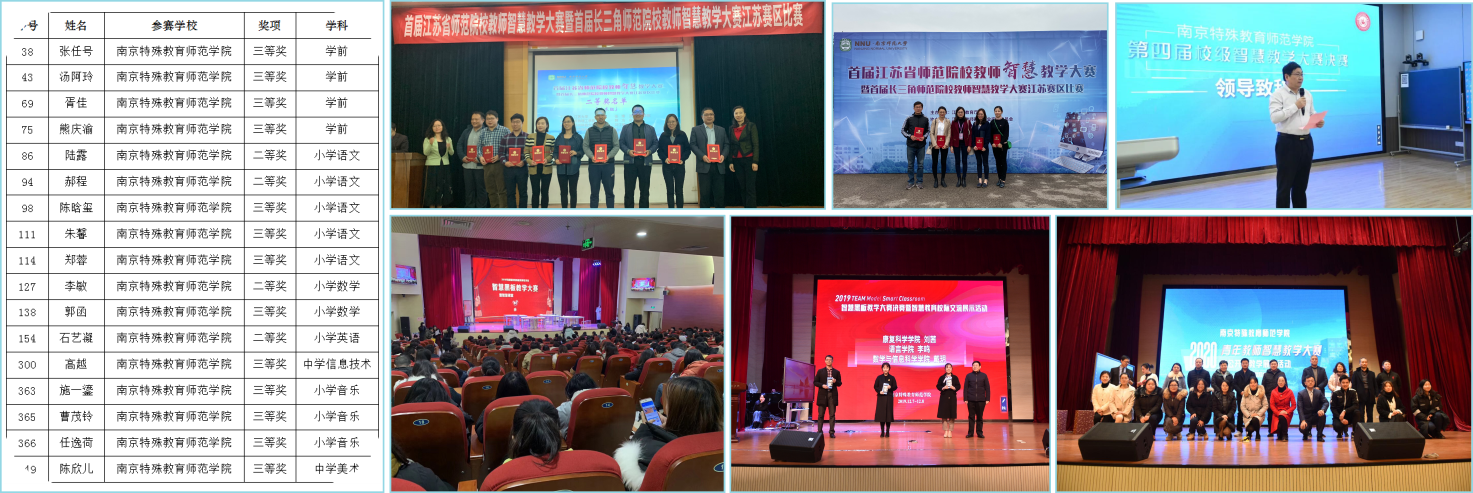 2019年南京特殊教育師范學院派出4名教師參加首屆江蘇省師范院校教師智慧教學大賽暨首屆長三角師范院校教師智慧教學大賽,獲得多項榮譽。第二屆江蘇省師范院校教師智慧教學大賽南京特殊教育師范學院的老師表現(xiàn)突出,斬獲17個獎項,獲獎數量四倍式增加。
