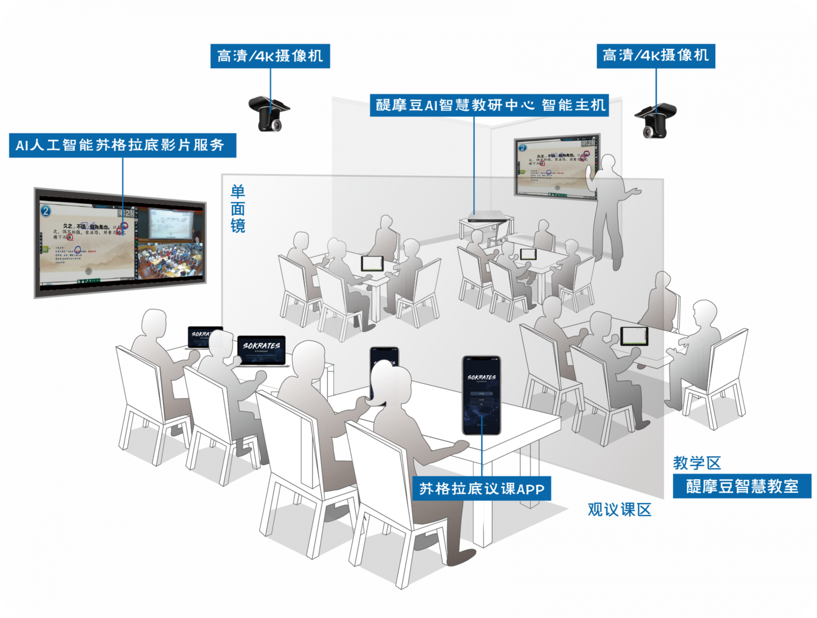 整合醍摩豆智慧教室系統(tǒng)、智能主機、蘇格拉底議課APP和AI人工智能蘇格拉底服務四種功能,在影音同步的基礎上,加上智慧教室的數據交互,建構“共備(課前)、共學(課中)、共研(課后)”三位一體的教師專業(yè)成長模式。同時采收專家智慧(議課APP)和教學行為數據特征(智慧教室),自動生成蘇格拉底影片和專家議課報表,協(xié)助教研團隊更科學、更高效進行議課與教研活動。