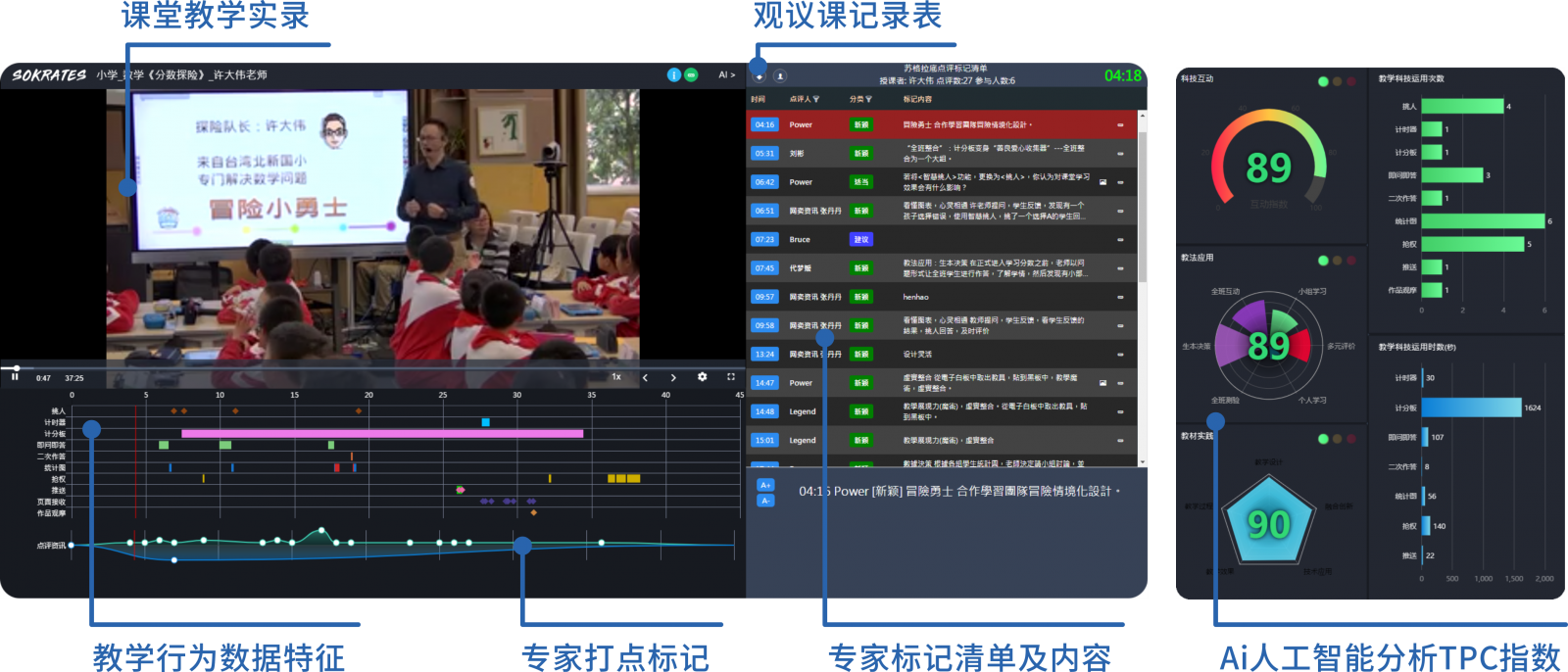 蘇格拉底影片整合課堂教學影片、教學行為數據特征、專家打點標記、AI人工智能分析,協(xié)助教師自我反思、探究、合作、分享,就像是老師們的AI智慧教練。