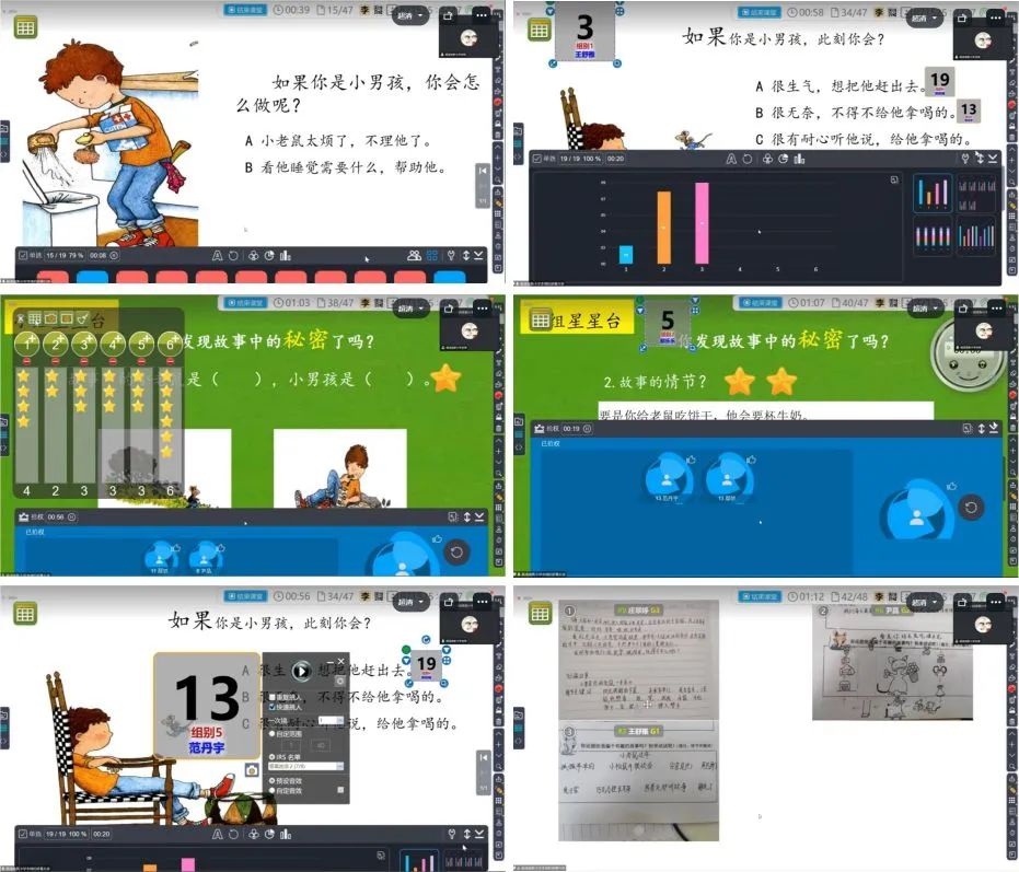 托爾斯泰曾經(jīng)說過:成功的教學(xué)需要的不是強(qiáng)制,而是要激發(fā)學(xué)生的學(xué)習(xí)興趣。針對(duì)二年級(jí)學(xué)生的特點(diǎn),李老師從一只小老鼠向一個(gè)小男孩要餅干入手,用猜內(nèi)容的方式激發(fā)學(xué)生的興趣,引導(dǎo)學(xué)生不斷地想象后面的故事情節(jié),并讓學(xué)生通過即問即答、智慧挑人、搶權(quán)、作品觀摩的方式感受這只小老鼠對(duì)于周圍事物的新鮮感。之后,李老師又引導(dǎo)大家思考故事中的小男孩是誰?小老鼠又像誰?引導(dǎo)學(xué)生聯(lián)系生活實(shí)際,幫助學(xué)生感知到父母對(duì)子女那種耐心的,無微不至的愛,揭示了繪本主旨。本節(jié)課通過七個(gè)問題,三個(gè)任務(wù)層層遞進(jìn),給在場(chǎng)的老師不僅帶來了視聽上的體驗(yàn),也帶來了新的思考,新的挑戰(zhàn)。